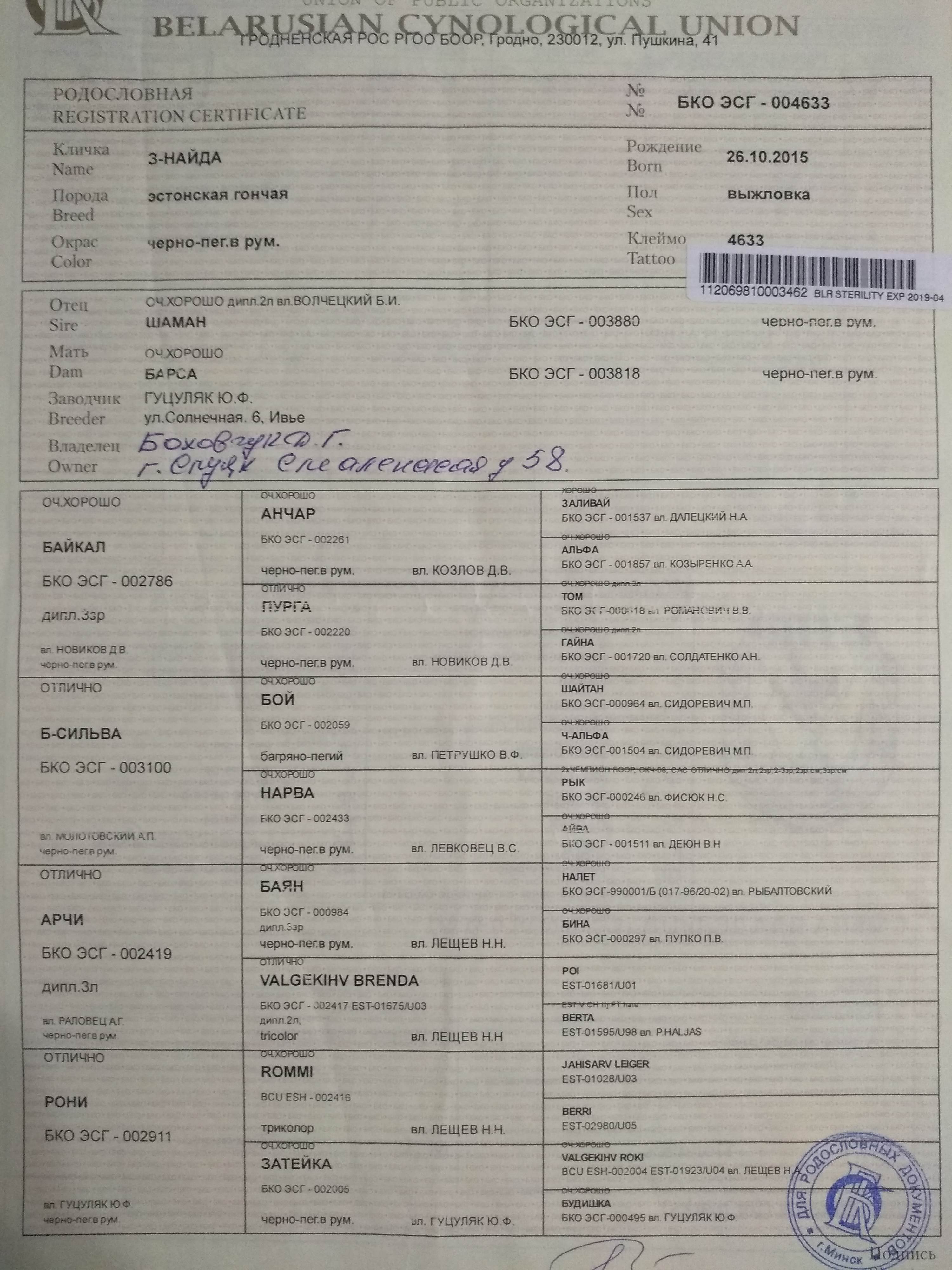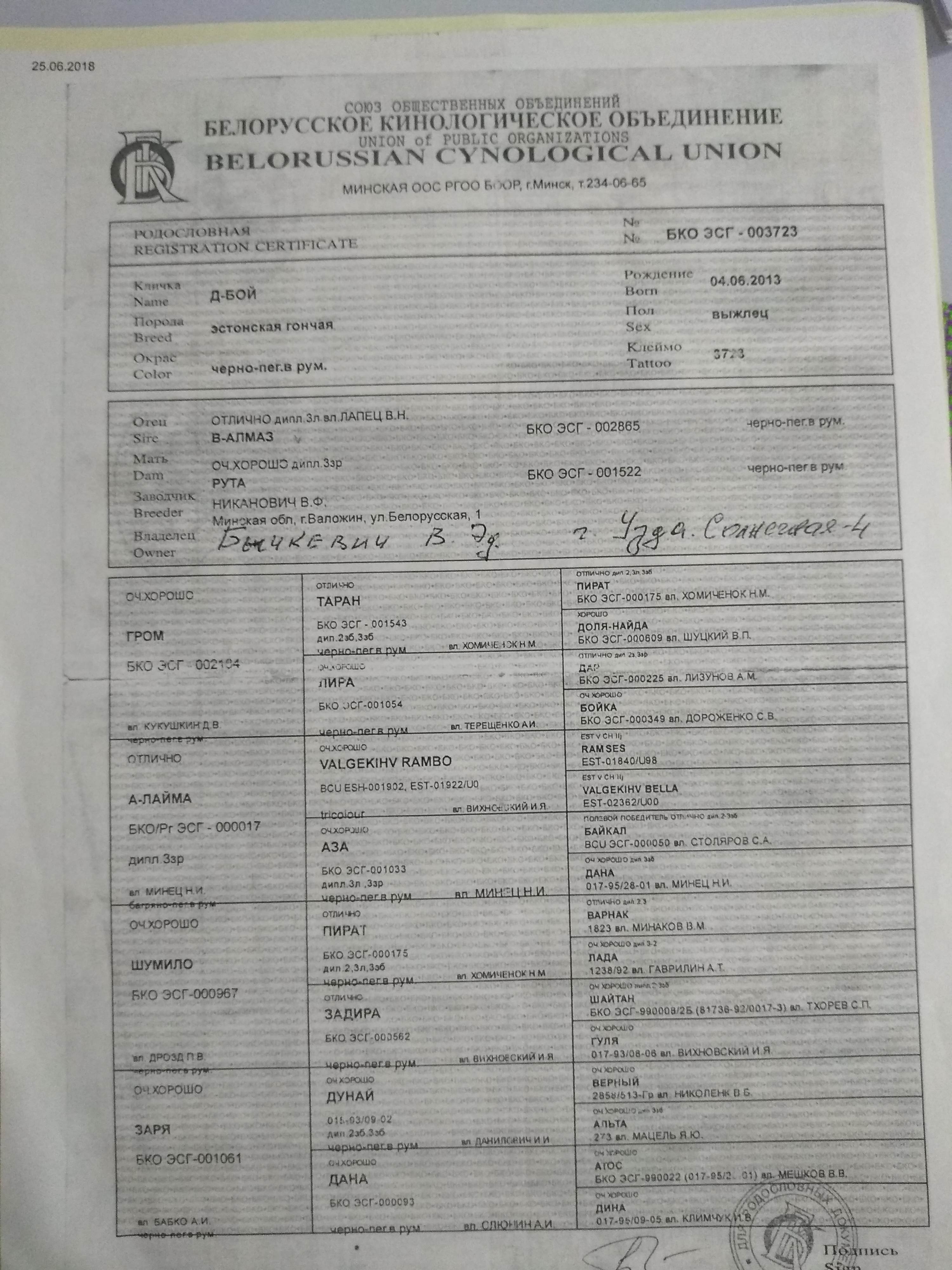 2.2.1 Кличка, номер родословной, фотография родословной с двух сторон.