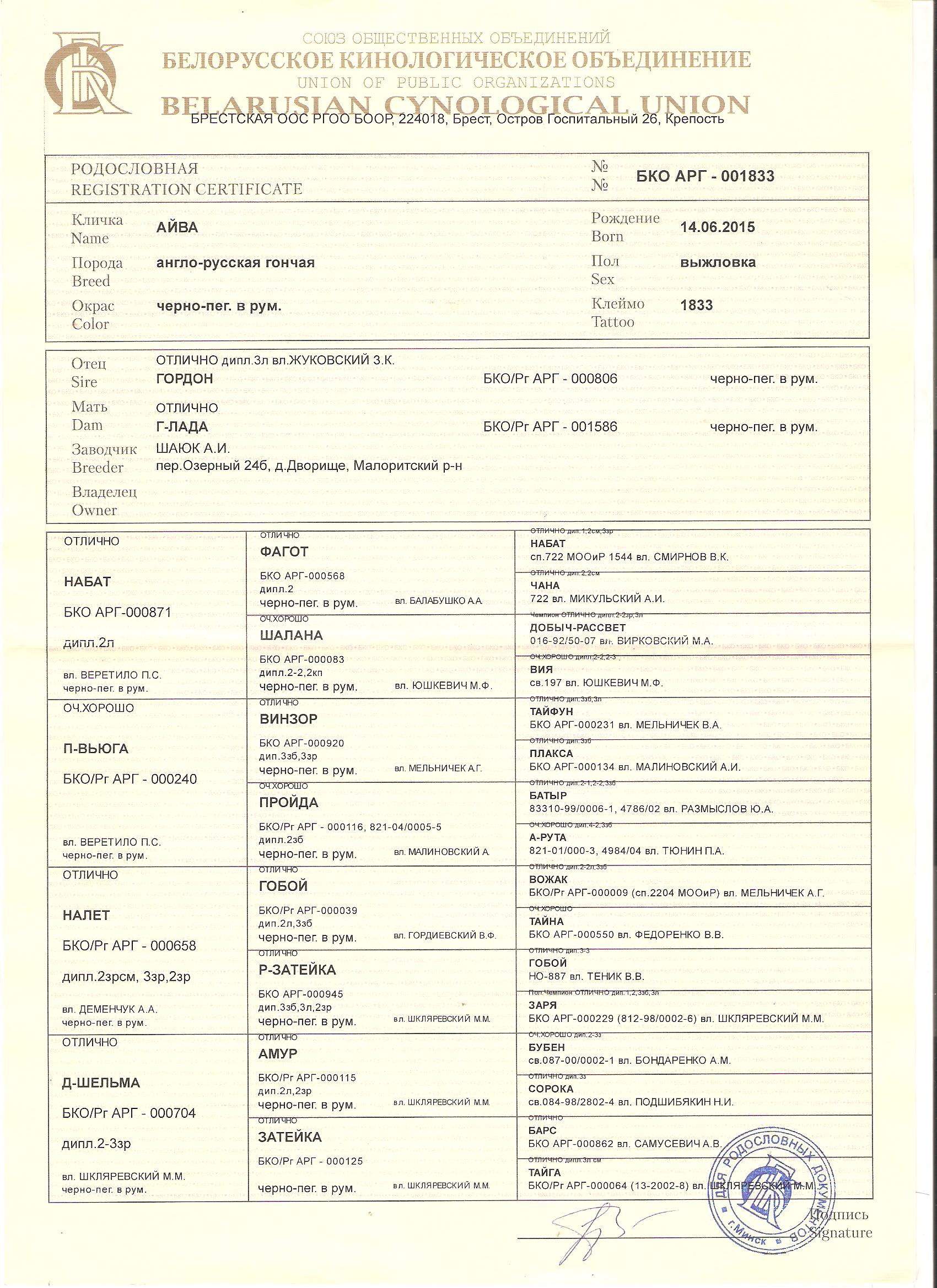 2.2.1 Кличка, номер родословной, фотография родословной с двух сторон.