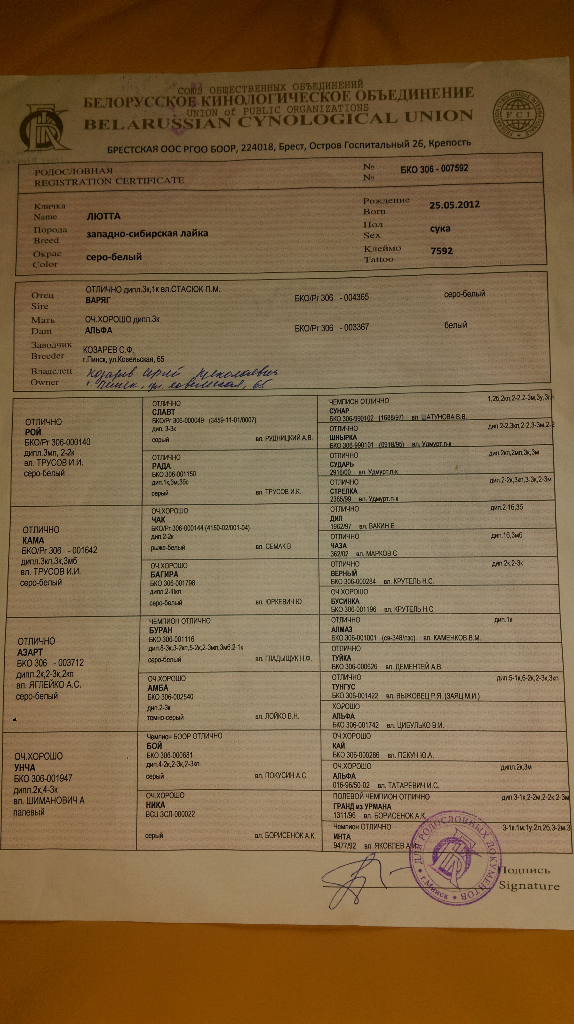 2.2.1 Кличка, номер родословной, фотография родословной с двух сторон.