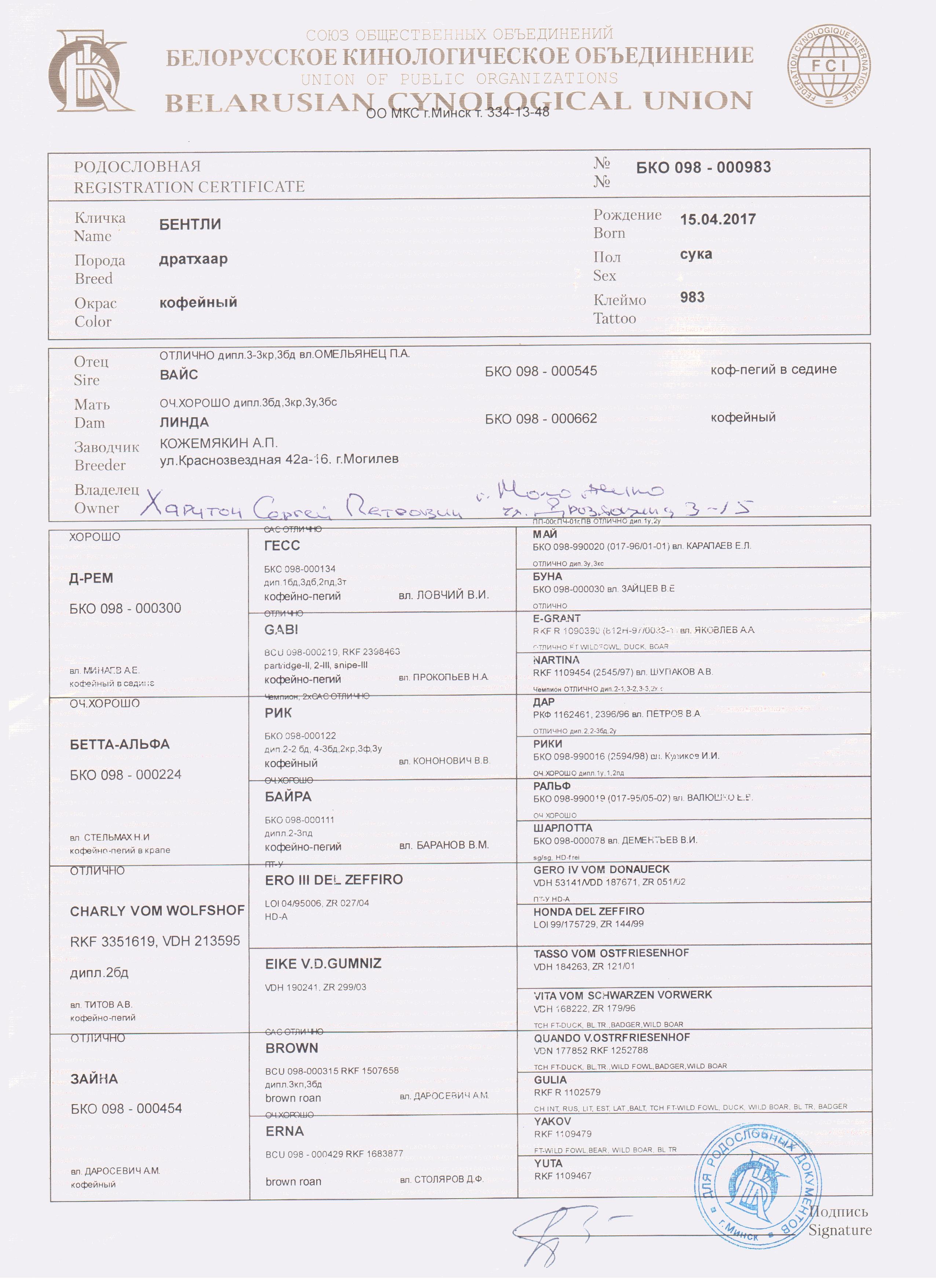 2.2.1 Кличка, номер родословной, фотография родословной с двух сторон.