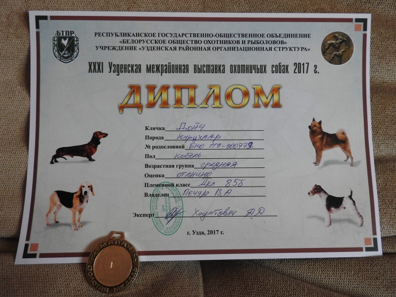 Оценка экстерьера: отлично, Лучший Юниор Породы, Лучший Кобель Породы, Юный Чемпион Беларуси, Чемпион Беларуси