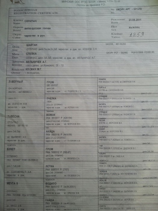 2.1.1 Кличка, номер родословной, фотография родословной с двух сторон.
