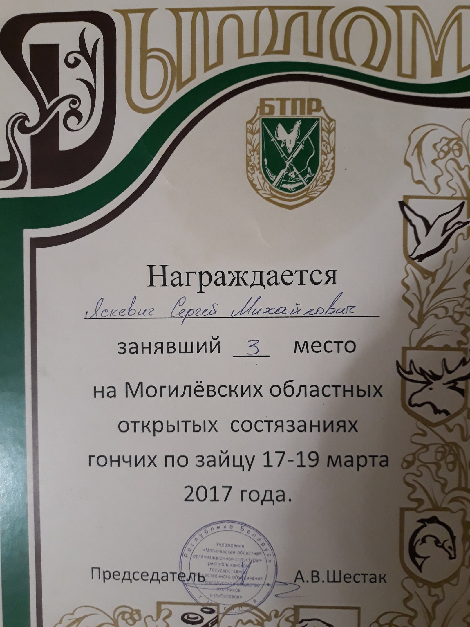 2.1.2 Племенной класс 1 Диплом 2 ст. заяц-русак, голос 7-2