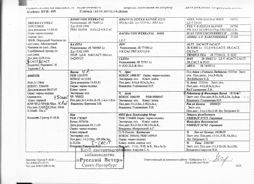 2.1.1 Кличка, номер родословной, фотография родословной с двух сторон.