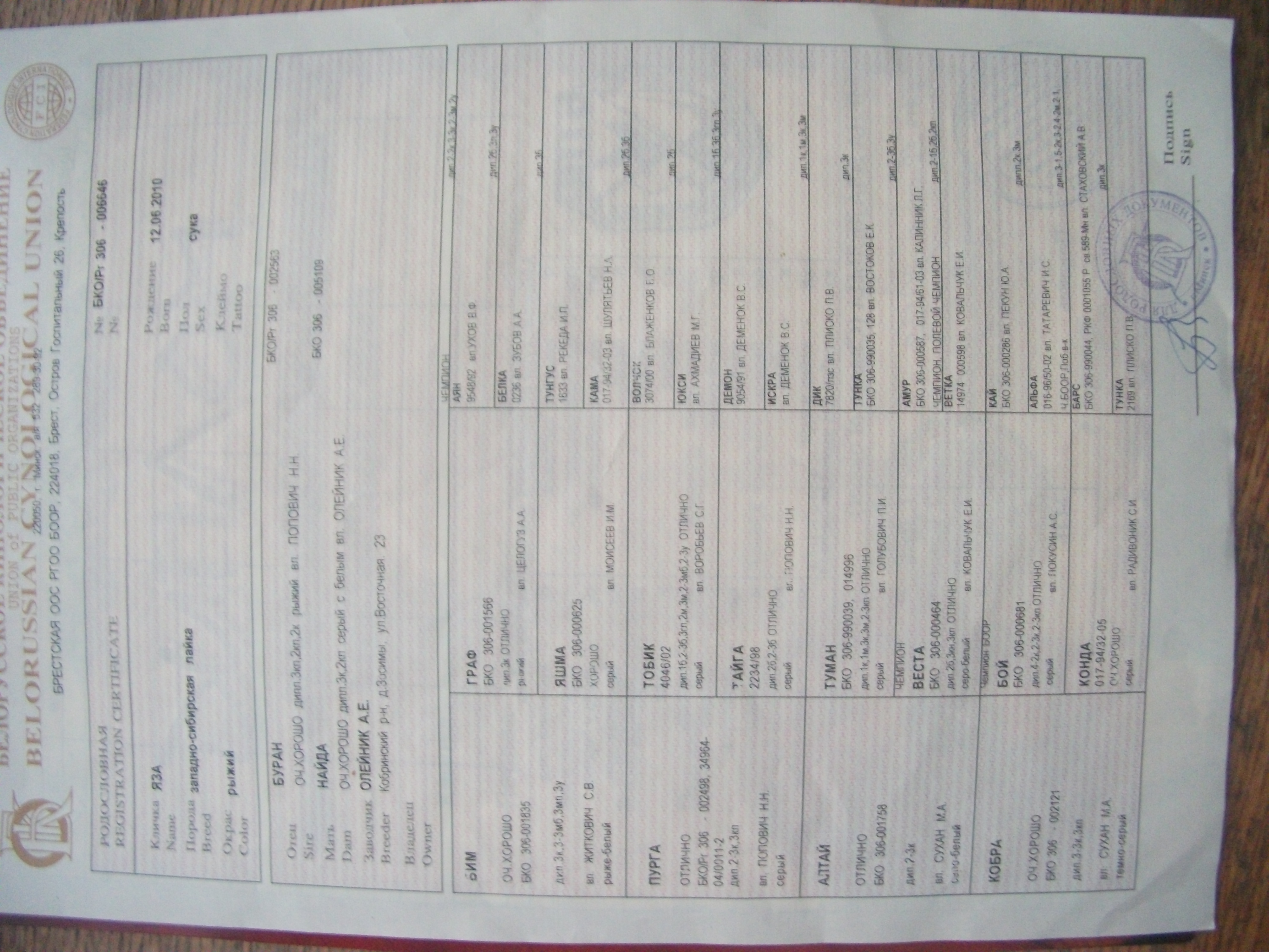 2.2.1 Кличка, номер родословной, фотография родословной с двух сторон.