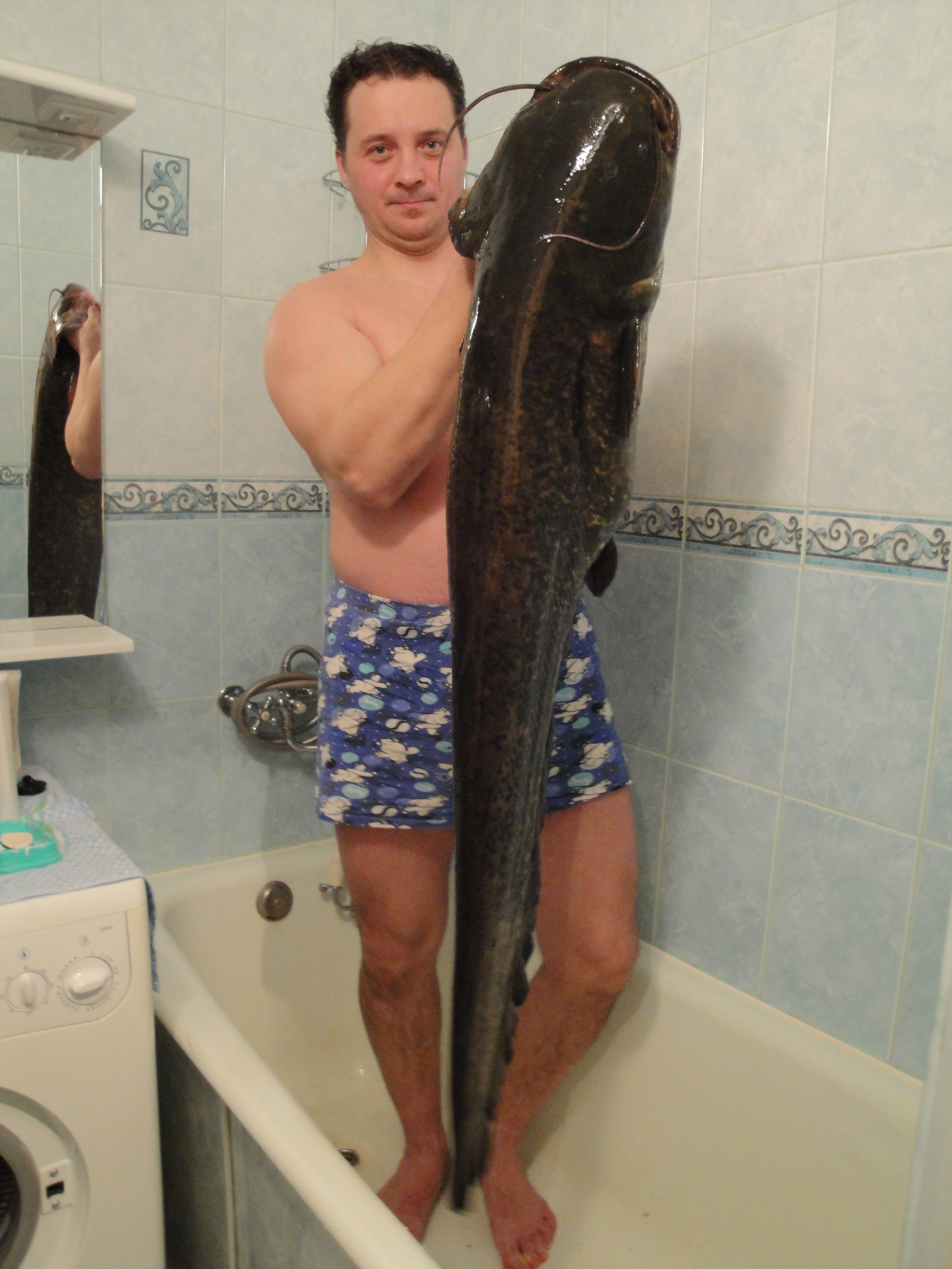 Вот ты какой родимый, с меня ростом вымахал, не ты ли мне тут пару раз снасти обрывал? Смотрю по сторонам, ни души, ну что родной, готов, сейчас я тебя обнимать буду. Честное пионерское отпустил бы тебя, если бы хоть кто рядом заснял нас вместе, да и кризис этот все ценности спутал. Так что дорогой только в ванну, а то ведь не поверят.