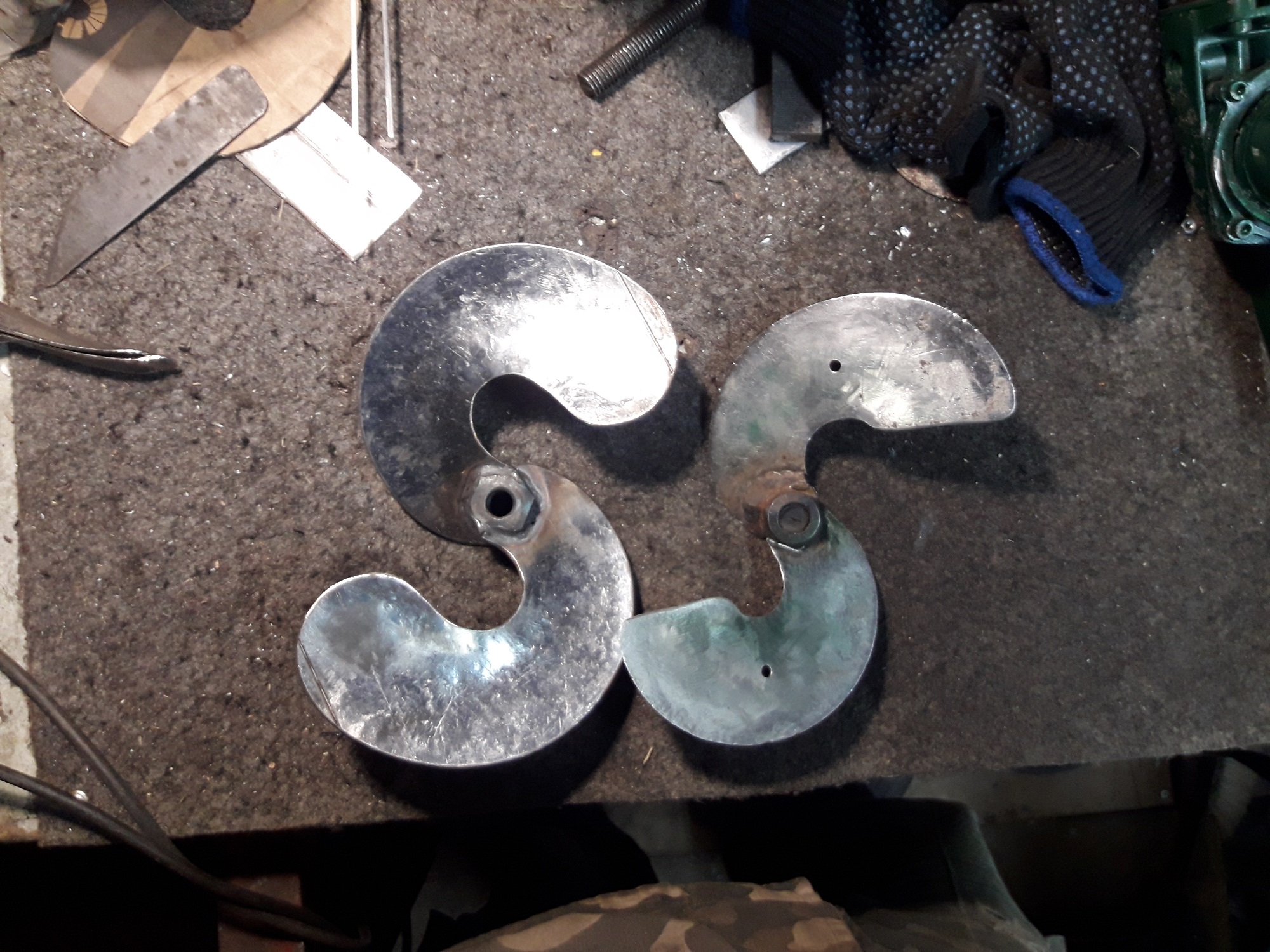 Новый винт уже тщательно обпилен со всех сторон, с плоскостей лопастей снят весь лишний металл, кромки подогнаны к ступице, заточены, и лопасти предварительно заполированы. Варился аргонкой в три этапа. С ковкой, подгонкой и добавлением разных усиливающих и препятствующих намотке водорослей элементов между сварочными работами. За раз как это ни странно, такой винт сварить не удается. Элементы приходится доваривать в процессе, когда уже более менее вырисовывается форма винта и их тогда можно под получившиеся на винте углы, более точно вырезать и подгонять. На данном винте, после 7 лет эксплуатации предыдущего, наконец дошло и то, что можно взять более крупную "гайку" и в процессе спилить с нее все лишнее нах..... Окончательные фотки готового винта, потом будут в теме про винты. znaika