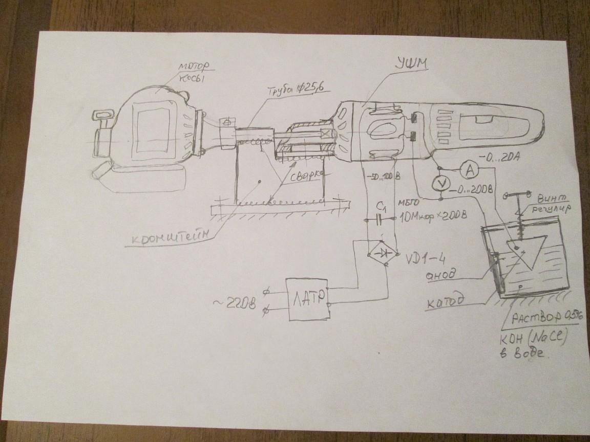 Лови! Приведенный рисунок -плод моей фантазии,можешь усовершенствовать,изменить или сделать все по-своему.Полазив по различным форумам,я понял,что такая схема жизне способна но есть одно "НО" : направление вращения не совпадают,нужно ставить реверсредуктор,а это дополнительная потеря эффективной мощности.Для сравнительных характеристик разных моторов подойдет.Даю пояснения.Соединение обмоток статора- последовательное.Пластины нагрузочного сопротивления (ведро с раствором)из нержавейки.Площадь пластин выбирается экспериментально,как и концентрация раствора.Необходимо только помнить,что выделяющийся на катоде газ-водород,а он взрывоопасен при концентрации менее 1% в воздухе.Для диодного моста можно использовать Д-243 с любым буквенным индексом,но на радиаторах,если помощне-то радиаторы не понадобятся.Ну вот и все.Что не понятно-спрашивай.Общими усилиями и твоим энтузязизмом мы победим этих "рекламщиков бесконечной мощности" !Jonson2 писал(а):Strumen писал(а):дам тебе простенькую,но весьма эффективную электрическую схемку соединеня и описание метода измерения мощности