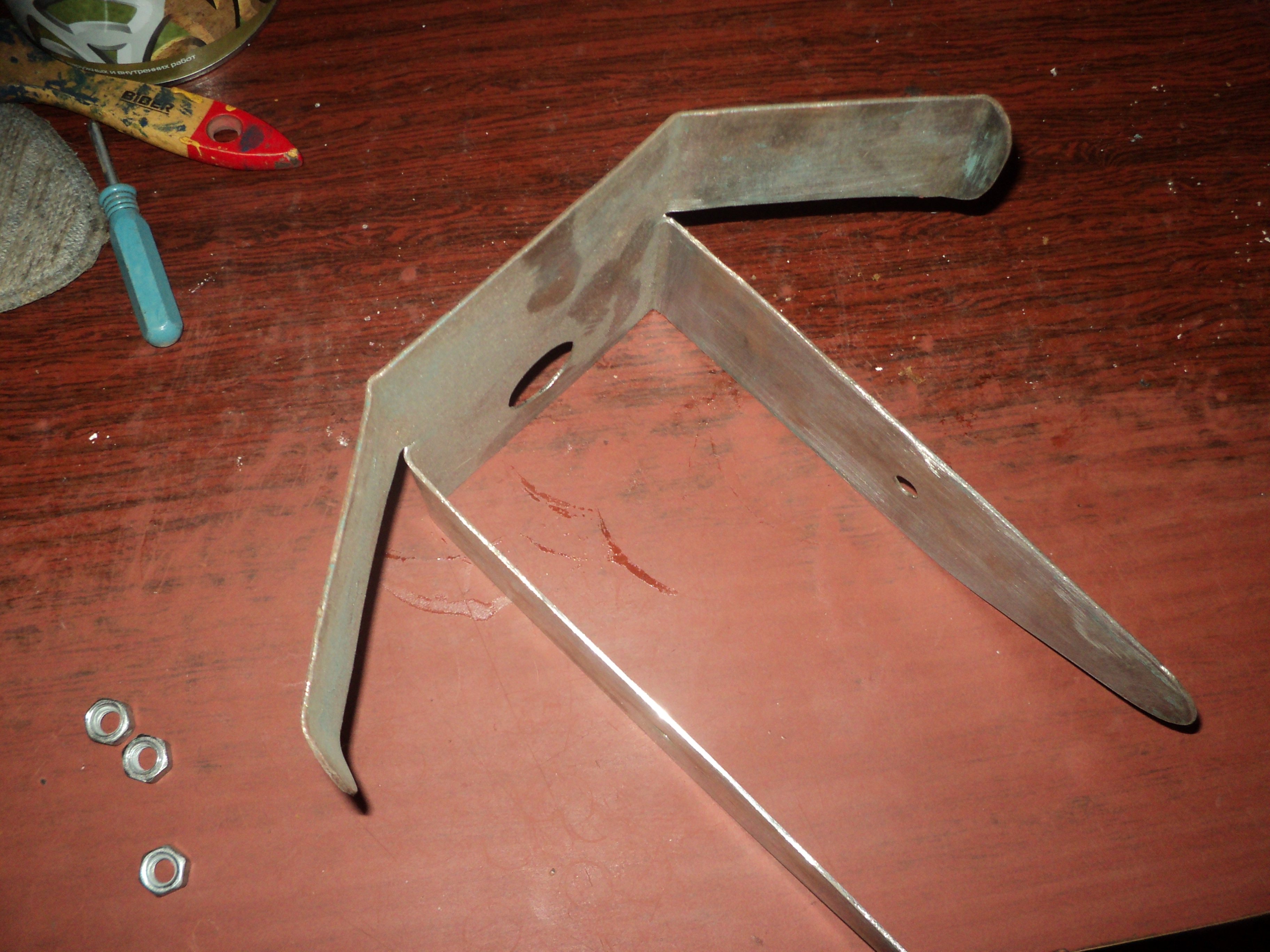 Эту хреновину делал из стали. Кожух на работе нашёл 1,2 мм и из него вырезал. А сейчас перо из дюральки , из шасси от магнитофона 4 мм толщиной.