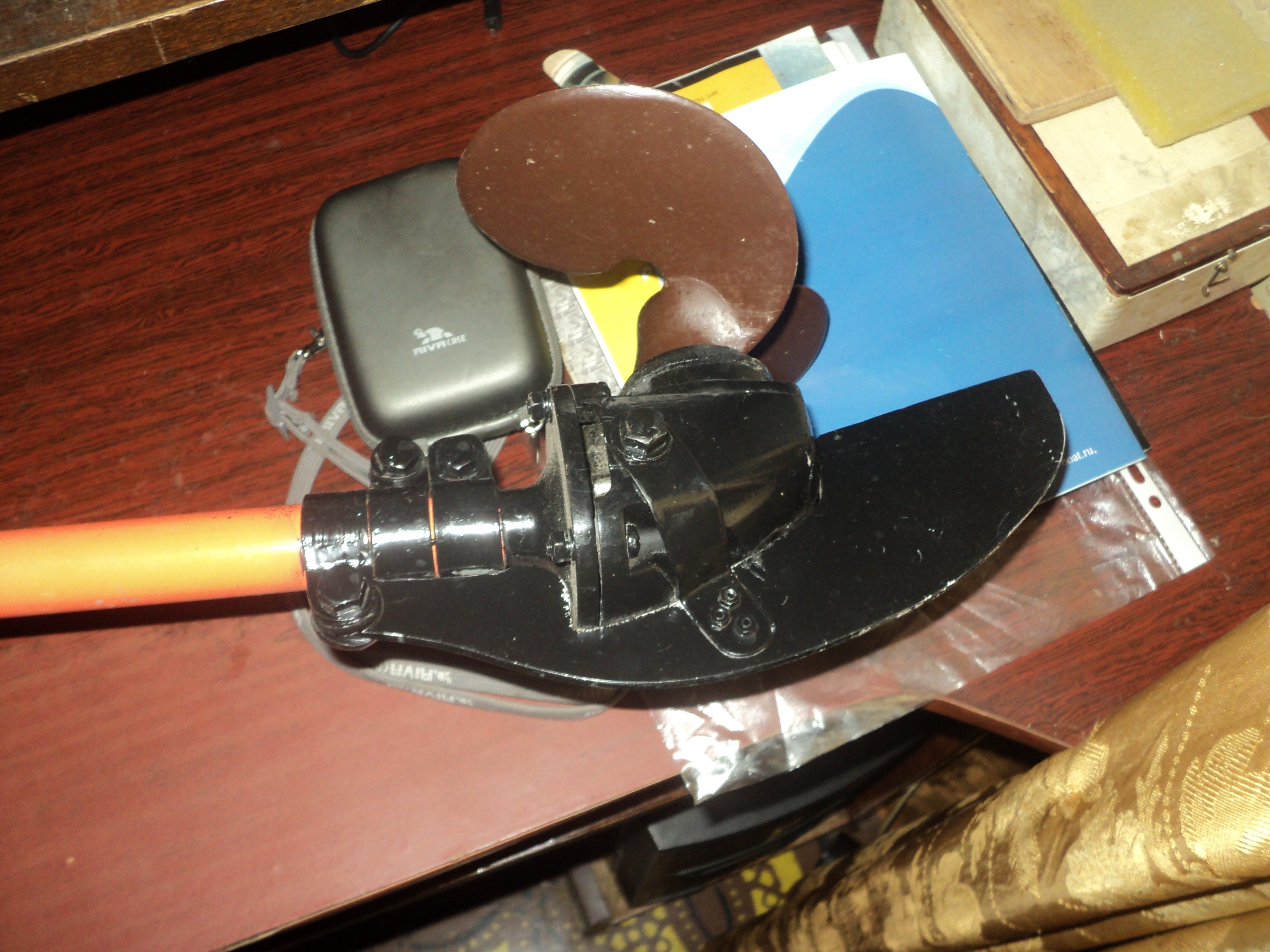 Попробуй , может понравится. Я себе сделал перо рулевое длиннее , чем редуктор. Крепится в трёх точках. Одна на трубе ноги и ещё две по бокам редуктора(в отверстия под ручки)