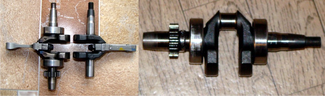 Изучив инет на тему маломощных 4т моторов, пришел к выводу, что хондовский BF2D это адаптированный для воды GVX57, который имеет собрата GXV50 а так же GXH50(с горизонтальным валом). Развивая мысль дальше, был найден китайский моторчег KG-55, который стоит на некоторых генераторах фирмы Kipor. Ход поршня на этих моторах одинаковый (у всех, про которые написал выше), отличаются различным исполнением конца коленвала, с которого снимается нагрузка, и диаметром цилиндра. Ну и были куплены коленвал от KG-55 и шатун, вышло около 1т.р. Но было одно но... у этого мотора конец колена обрезан, мотор стоит на генераторе, и нагрузка снимается с того же конца коленвала, где и висит маховик с крыльчаткой. Ну и пошел уже знакомый процесс "обрезания".