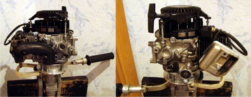 На картере гордая надпись Honda. Видно проставку карбюратора, двухслойная - металл и полимер. Если ее убрать, то можно карб повернуть на 90гр и поставить двиг вертикально(унификация запчастей.) Справа расоловиненный мотор(по диагонали - хондовская примочка)