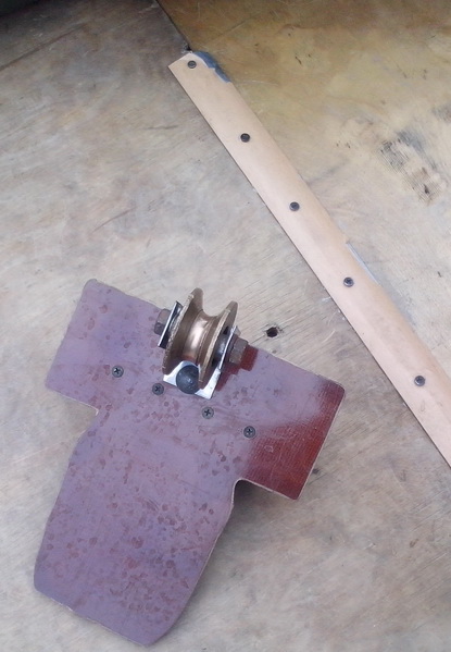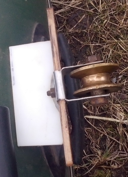 3. для удобства поднятия якоря, приделал блочёк на пластину, добавил упор, чтобы придать правильный угол и вставил конструкцию в ручку для переноски лодки...