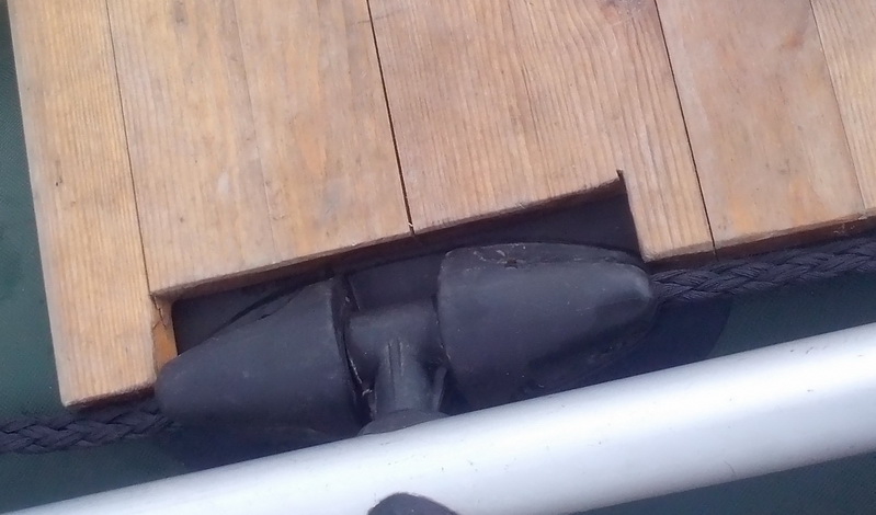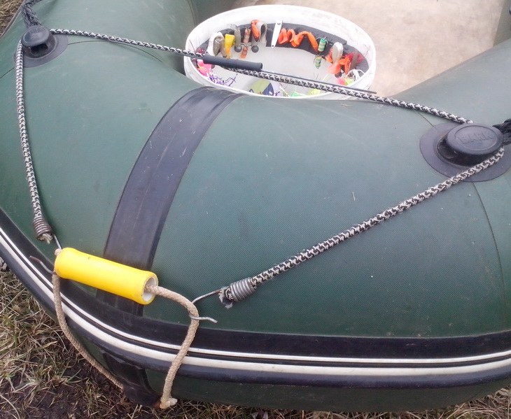 ведро, дабы не летало по лодке, прикрепляю резинкой от эспандера к ручке для переноски лодки... заодно и ручку держит вверху, чтобы по воде не шлёпала...