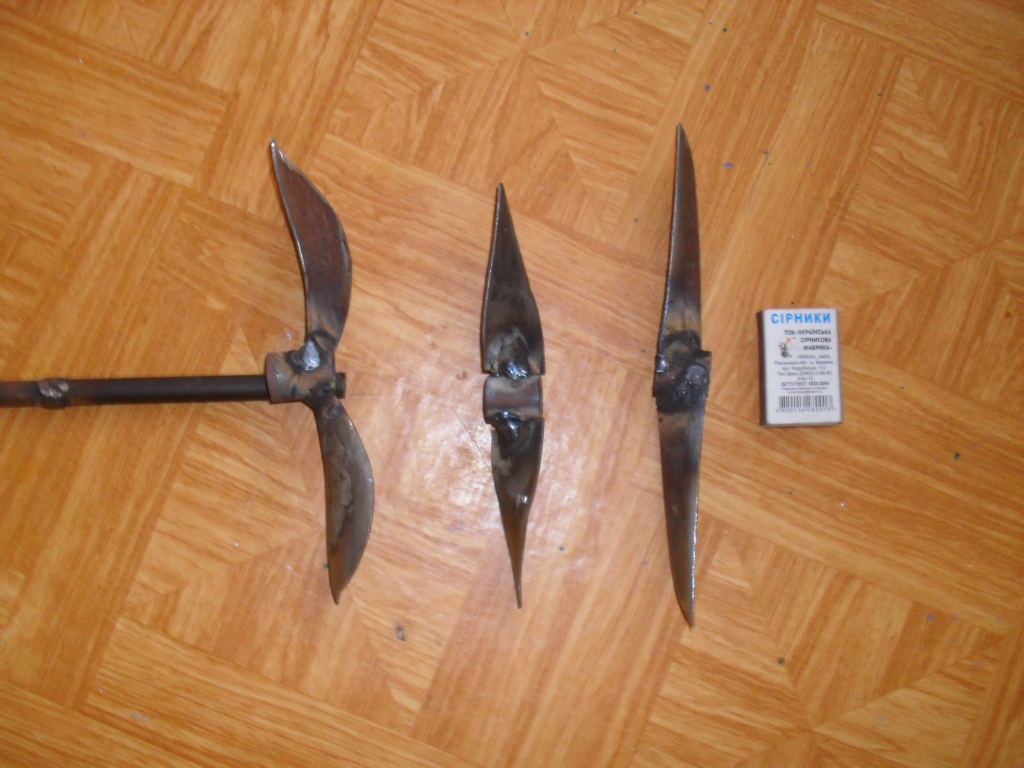 Здрасте бояре!Опять все про винтики,если не все,то очень много.Я тоже на досуге решил болгаркой поиграться.Из трубы-100мм толщина-3мм нарезал сигментов.Буду пробовать :du_ma_et: Переднюю кромку затачивал очень хорошо.Одна их фотографий-лопнул вал,следовательно соединения на высоконагруженных частях лучше заклепки (металлические).Джонсон много и правильно говорил о винтах.Согласен на все сто.К каждой косилке со своим редуктором надо подбирать индивидуальный винт,ну и по-моему мнению просто делать и пробовать,делать и пробовать (шаг и крутку менять в разных диапазонах).