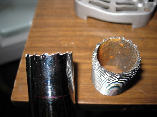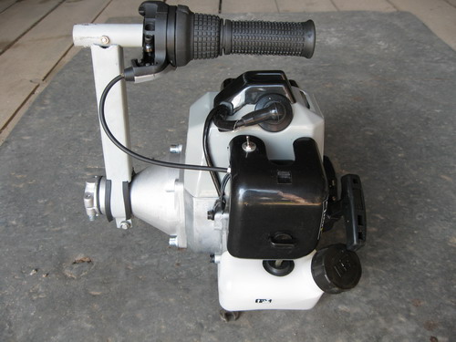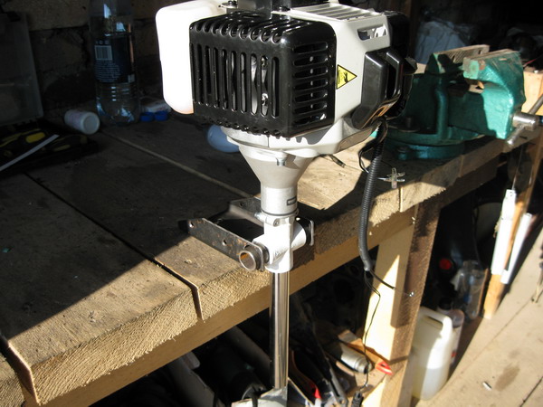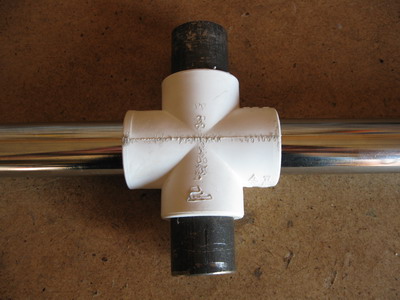 Долго ломал голову, из чего с минимальными слесарными работами сделать узел крепления двигателя с двумя степенями свободы. В магазине сантехники нашёл крестовину из какой-то пластмассы, не знаю, как называется, но достаточно прочной и вязкой. Купил дюймовый сгон. Внутренние размеры крестовины были несколько меньше необходимых. Пришлось из отрезков трубы и сгона надфилем сделать фрезу и метчик. Крестовину в тиски, полчаса пота и два мозоля на ладонях. Фреза очень даже запросто прошла насквозь простым вращеним руками с небольшим усилием. Зато отверстие получилось ровным, посадка плотная, без люфтов. С нарезкой резьбы под сгоны тоже прошло на-ура.
