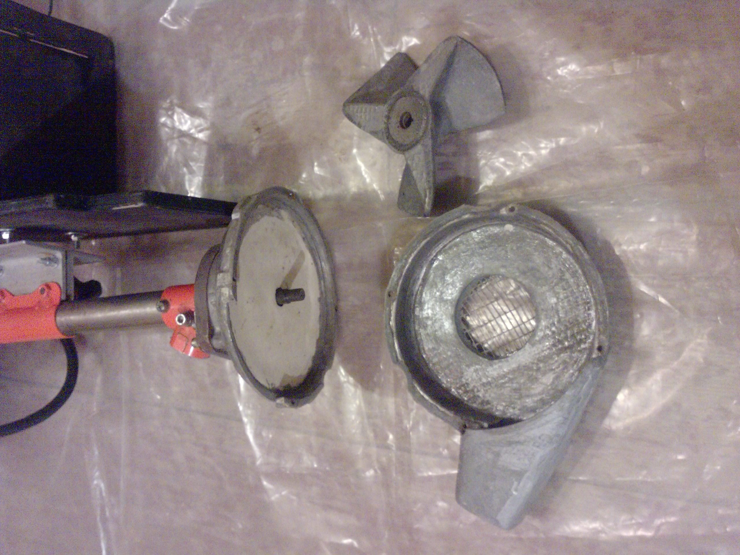 Слабовато- не то слово, полное разочарование.Сначала лодка еле плыла. Пришлось на сопло одеть пластиковую бутылку, увеличилась скорость , но пропало тягло. На больших промежутках лодка разгоняется,а при развороте на 180гр ещё метра 3 плывет по инерции и лишь потом набирает ход.Это уже второй вариант и его даже сырым не назовешь, уж очень хотелось испытать , осень кончалась. Вместо крыльчатки был использован винт из В.1 , немного модифицирован . Использование винта в улитке - полный бред т.к. создается давление в камере,которое потом успешно им преодолевается. Улитка была отлита из эпоксидки на скорую руку и очень каряво, что в итоге привело к большим потерям на трении и турбулентности .(неровности в сопле, т.е. отклонение от вектора выхлопа ( ямки, бугорки , изгиб плоскости) на 7мм в любую сторону , приводят к возникновению завихрений,сильно понижая КПД это по науке).Считаю общее направление мысли правильное, осталось изготовить забористую крыльчатку на 6-8 лопастей с п о д п о р н ы м и пластинами сверху и снизу ( получится диффузор), для устранения рассеивания потока воды и снижения сопротивления( трения) крыльчатки в камере, и можно ждать лета. Если все сделать правильно то КПД такого агрегата 70% ,если мне не изменяет память.Зная рабочий объем крыльчатки, КПД ,обороты и мощность можно загадать нужную скорость( в размерах разумного) и ограниченную мощностью двигателя и интуитивно просчитать сечение сопла. К стати на HONDAвских водометных приставках использован тот же принцип, к сожалению они не светят внутренности. И на всякий случай выкладываю фотки мотора , может кого и заинтересуют.