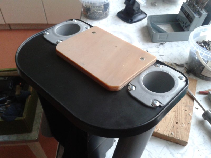 и придумал. Я нашёл дома мариал похожий на оргстекло, только непрозрачное, вырезал площадочку и склеил между собой. Получив по предварительным расчетам нужную толщину, при которой концы саморезов не вылезут, подобрал винты с нужной длины.