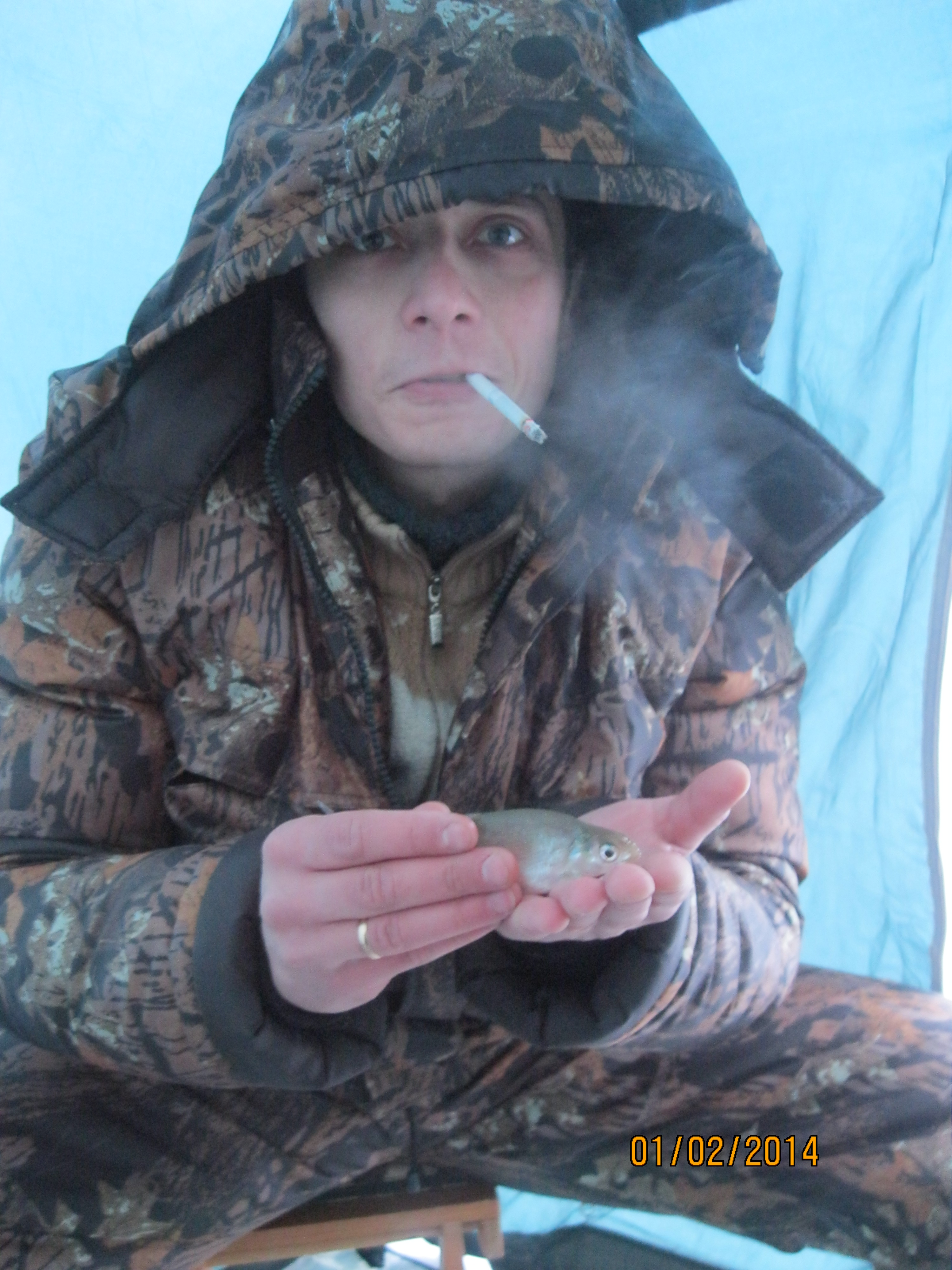 Хищник(окунь) тоже молчал, рыба на отрез отказалась кушать любимый ею мотыль да сверкающие блёсенки)) Ближе к обеду начало проклёвываться но раслабленный организм привыкший к стоячиму поплавку реагировал медленно , поитогу ище 3 ри схода, один негодяй даже умудрился запутать две удочки и когда его вытаскивали вытащили и рядом стоящую, плю к томуже подлещик мохнул хвостом и с грациозностью гимнаста шмыгнул в лунку оставив нас с мишей с запутанной леской