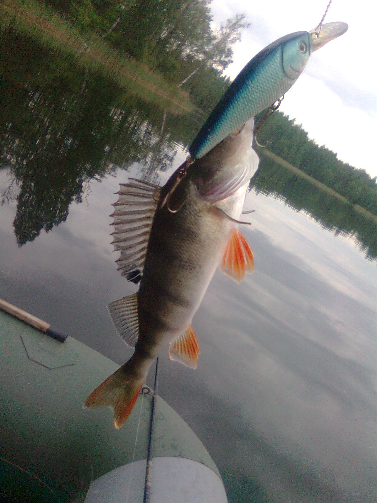 . И вот в таких условиях ( полное отсутствие активности хищника ) пришлось тестировать новые вертушки-гальванопары. Чуть позже о результатах первого тестирования отпишусь в нужной теме . А теперь о рыбалке ... Повторюсь - хищник никак себя не проявлял , в камышах и кувшинках ни единого всплеска , на открытой воде ни одного выпрыгивающего малька . Тучи всевозможной рыбьей мелочи вольготно себя чувствовали у прибрежной растительности - никто их не беспокоил . В субботу с 6-ти утра и до обеда удалось выдурить пару-тройку матросиков пиписочного размера ( таких даже на живца брать стыдно ) . Опрос соседей подтвердил полный анабиоз хищника . После лёгкого перекуса с новыми силами принялись бороздить озеро в поисках достойной рыбы . Перебрали почти все виды подходящих приманок , а в результате снова - ОПА