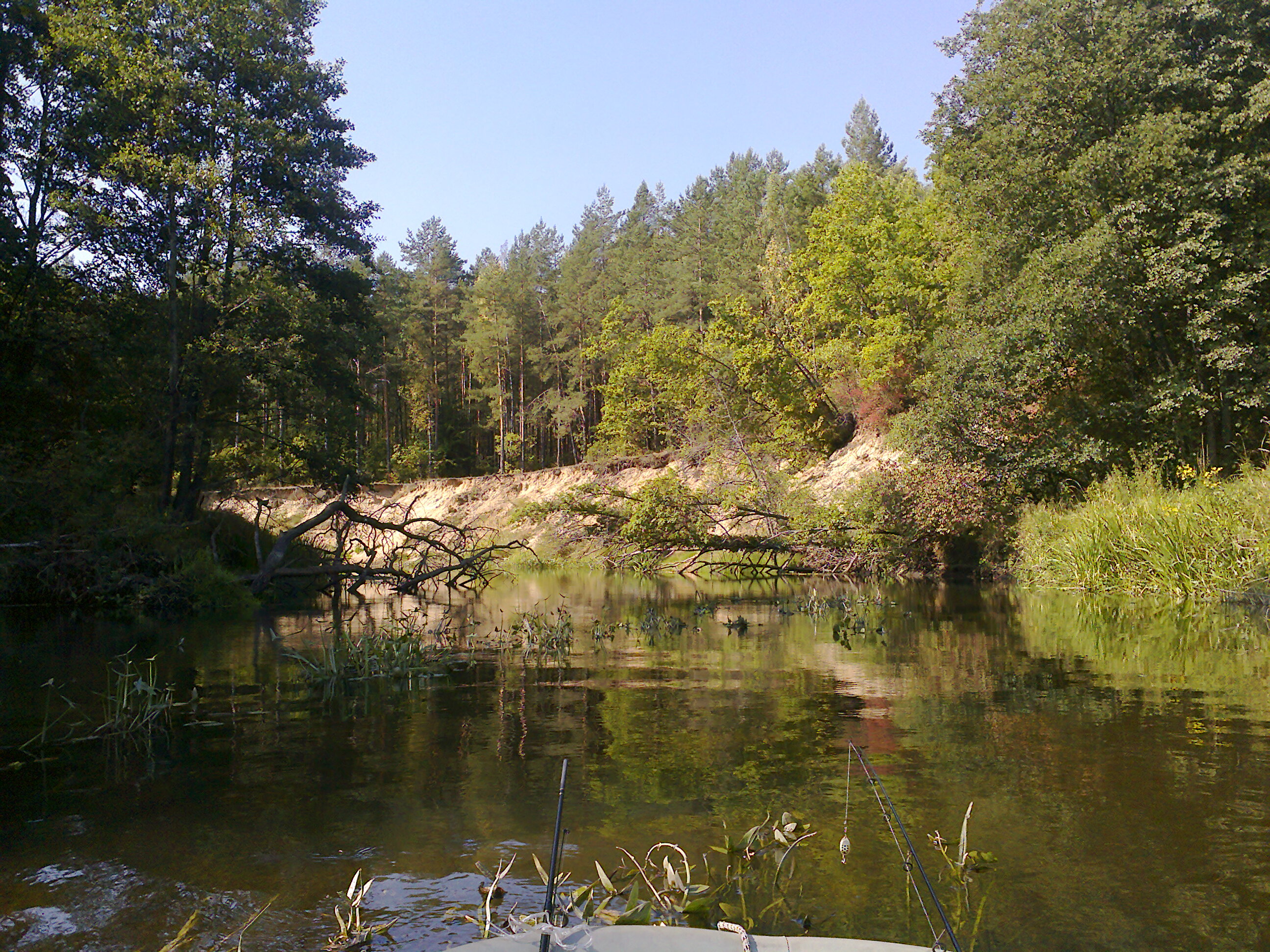 ВЕРХНИЙ НЕМАН С ТОЧКИ ЗРЕНИЯ ЛАЙТ-СПИННИНГИСТА. В этом году возникла идея пройти сплавом верховья Немана на надувной лодке, облавливая приглянувшиеся места. Пользуясь Гугл-карты, поделил Неман от Песочного до Столбцов на части, чтобы за световой день пройти отрезок, не особо напрягаясь греблей и успеть обловить старицы, поворотные ямы, обратки и другие интересные спиннингисту места. Получилось 4 отрезка - Наднеман-Могильное, Могильное-Лунино, Лунино-Миколаевщина, Миколаевщина-Столбцы. Это примерно по 12 - 15 км. по реке каждый отрезок. Договорился о доставке к месту старта каждого этапа и обратно. Ловили в основном, на вертушки т.к. мелко и их в коллекции не одна сотня штук,но пробовали и резину с воблерами на глубинах. Целью был хищник,голавля ловить не планировали. Первый отрезок мы прошли в начале июня, остальные в августе-сентябре. ВПЕЧАТЛЕНИЯ: крайне низкий уровень воды,очень высокая прозрачность,очень слабое течение(при встречном ветре лодка стояла на месте). Первые три отрезка сплавлялись в ясную, жаркую погоду, последний в пасмурную, с сильным северо-западным ветром. Стартовали мы в Наднемане, у ворот усадьбы Наркевичей-Йодко. Река течет, в основном,по открытой залуженной местности, местами распаханной до уреза воды. На протяжении всего первого участка глубина небольшая, практически везде видно дно, а в местах разветвления русла на рукава и на бродах лодка чиркала дном по песчаным отмелям. Берега поросли аиром, реже рогозом, есть прибрежная водная растительность. Интенсивный облов разными приманками вдоль границы водорослей позволил вымучать несколько окуней, поклевок щуки не было. Ниже Костешей обловили большую старицу.Малька в ней тучи, поклевок не дождались. Вторую старицу обловили ниже Яршей и третью недоплывая Могильного - безрезультатно. Несмотря на отсутствие клева река не показалась мертвой - постоянные всплески и визуально в прозрачной воде видны были стайки белой рыбы, иногда единичные экземпляры под килограмм и более. Продолжили сплав от Могильного до Лунина в середине августа. Воды в реке стало еще меньше,прозрачность увеличилась, дно просматривалось даже в двух-трехметровых омутах, но река течет по лесистой местности, соответственно множество упавших в реку деревьев создают привлекательные для рыбы закоулки, облов которых приносит все тех же окуней. Поклевок щуки по прежнему нет. Интересные пороги создает газопровод, проходящий по дну реки ниже Могильного.Перед ним глубина увеличивается, течение замедляется, поклевывал окунь. К сожалению, немногочисленные старицы этого участка, в том числе и Лунинская обмелели и сильно заросли, половить в них не удалось.Еще одно интересное место перед островом возле Сверинова - река расширяется, течение замедляется, клевали окуни. Визуально наблюдали стаю килограммовых лещей под сотню штук, которые с несвойственной им большой скоростью, неслись по мелководью вверх по течению мимо нашей лодки и крупную рыбину под 3 кг.(жерех или голавль), медленно баражирующую среди трав на мелководье. Участок Лунино-Миколаевщина, на мой взгляд наиболее интересный для спиннингиста: река сужается, углубляется,становится очень извилистой, с большим количеством поворотных ям, стариц, обраток.Жаль, что яркое солнце, жара и очень низкая вода, навскидку сантиметров на 80 ниже обычного уровня