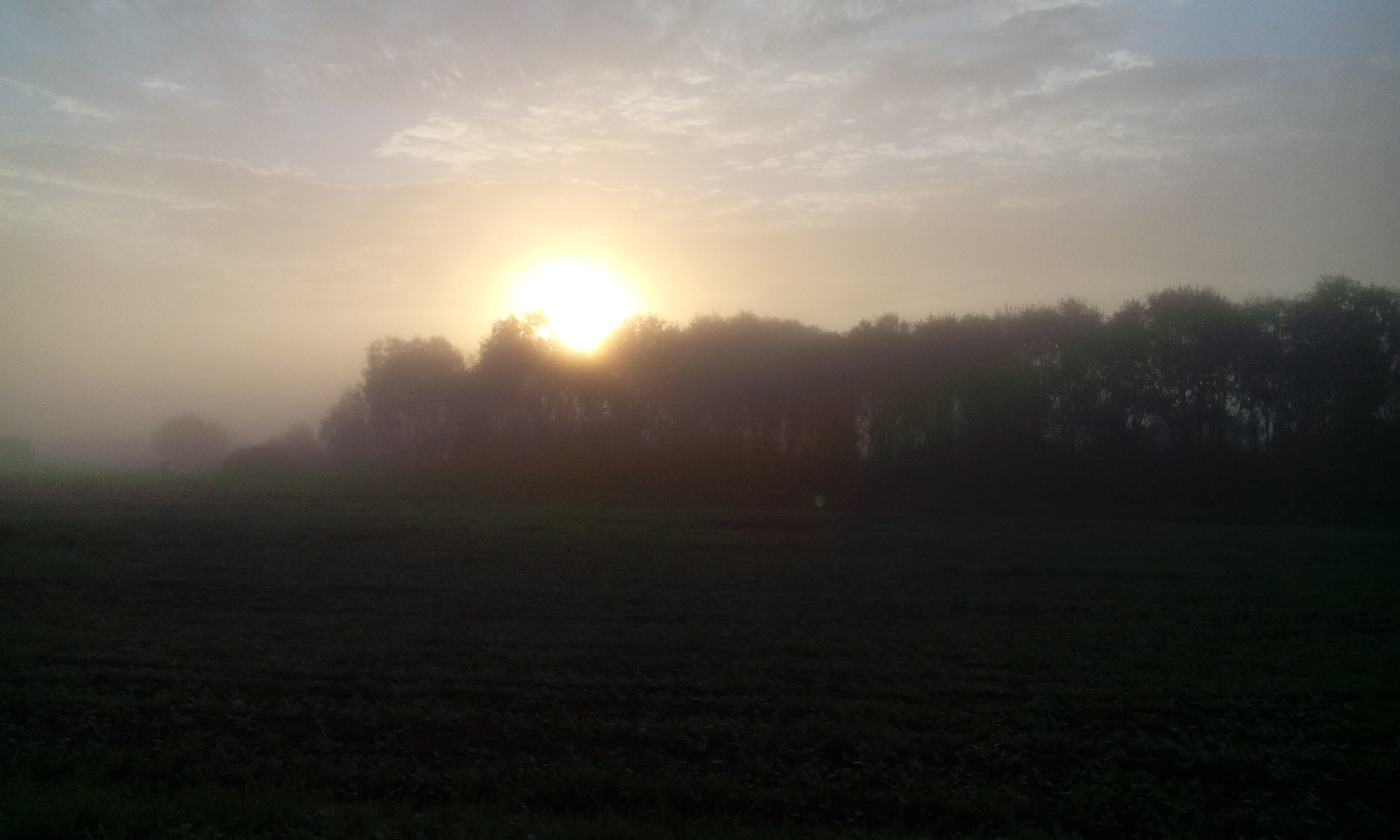 Куда же исчезла эта радость, когда я возвращался с охоты - неизвестно! Но об этом позже. Туман был очень густой и видимость практически нулевая. Как писал ранее, из-за долгой жары водоплавающие птахи в наших угодьях совсем не радуют взор своим присутствием. Не смотря на это, все равно тянуло меня по пути следования в лес оббежать добрую тройку километров мелиоративных каналов - авось что за недельку подлетело. Напрасно... :-( ни одного подъема пернатых. Зато душа порадовалась прекрасному осеннему рассвету в густой дымке тумана :co_ol: . Возвращаясь назад к машине на другой стороне последнего канала были услышаны забавные крики петухов-касачей. Подпустили довольно близко, но на другом берегу из-за высокого бурьяна не удалось рассмотреть красавцев. Только представил их себе раздутых и бегающих по земле с распущенными хвостами. Утреннему осеннему солнцу удалось не слабо меня согреть. Это сильно подняло охотничий дух, а душа в глубине удивлялась беспощадным погодным разводам сайта "гисметео.бай". Скинув с себя пару одеженок - мчу в леса за красавцем рябчиком, которые в прошлые выходные неплохо порадовали своим присутствием в данном лесу, а главное - замечательной охотой.