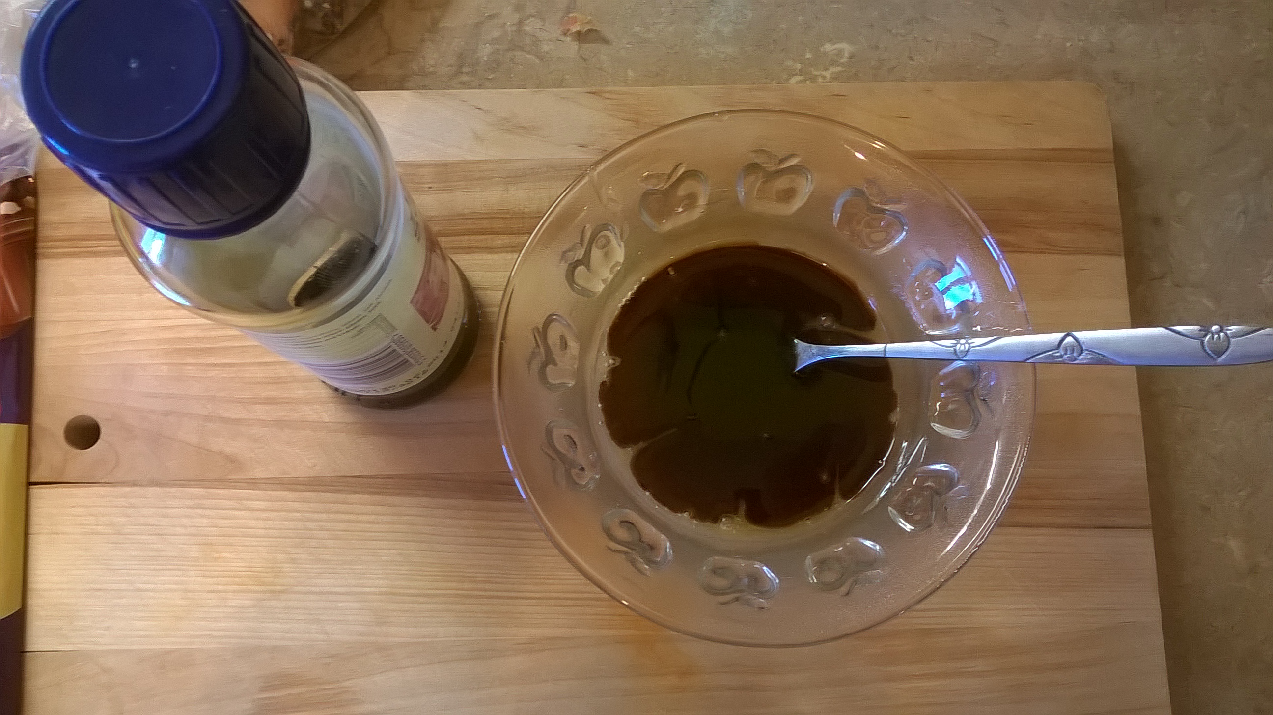 Пока птичка стоит в духовке, готовим следующий соус - смешиваем мед с соевым соусом, это последний соус для намазывания птички, он придаст ей золотистый цвет и неповторимый вкус ее корочки, в корочке вся фишка блюда ;)