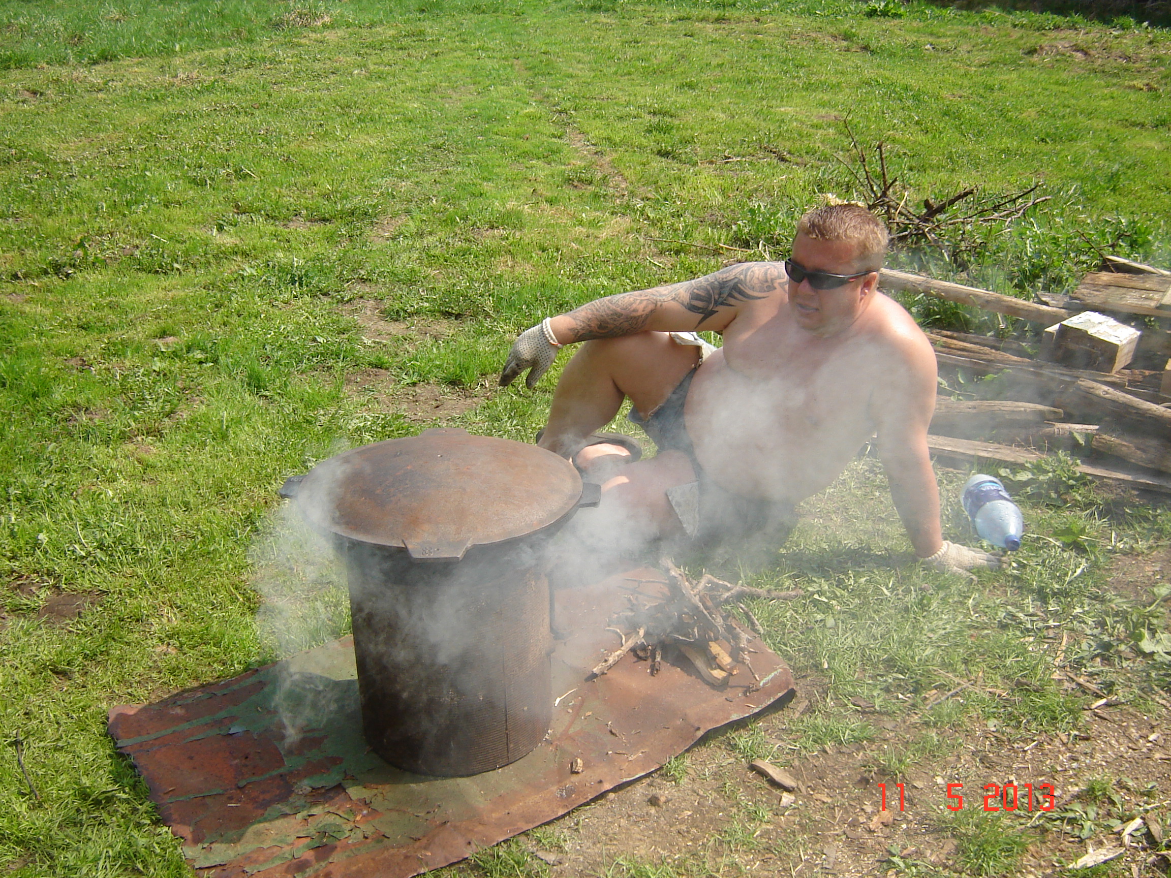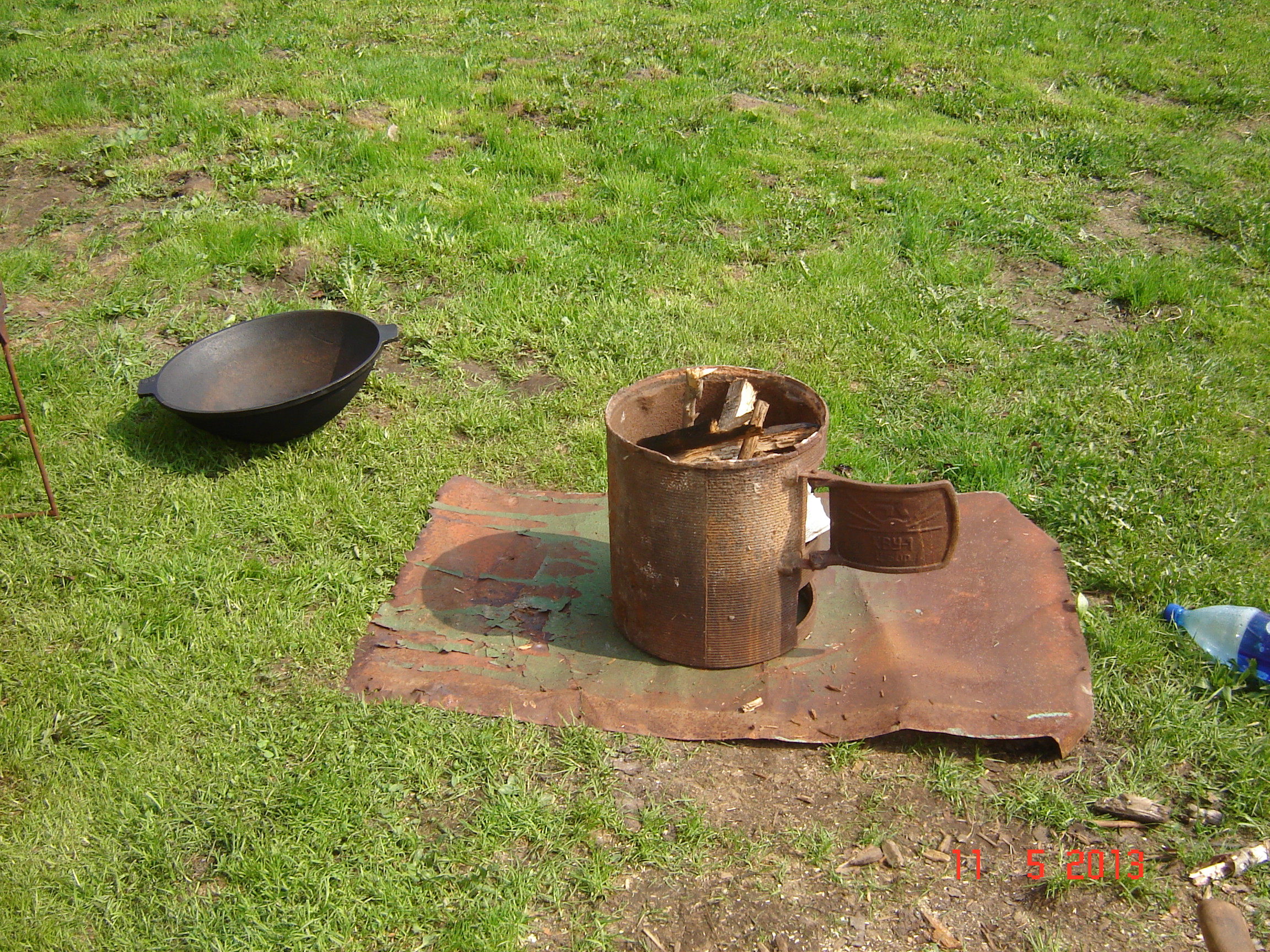 старый лист жести,что-то типа буржуйки и чугунный казан
