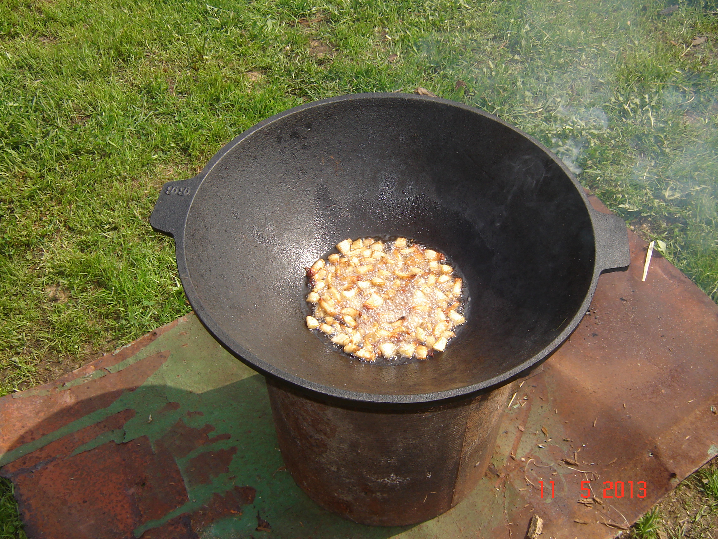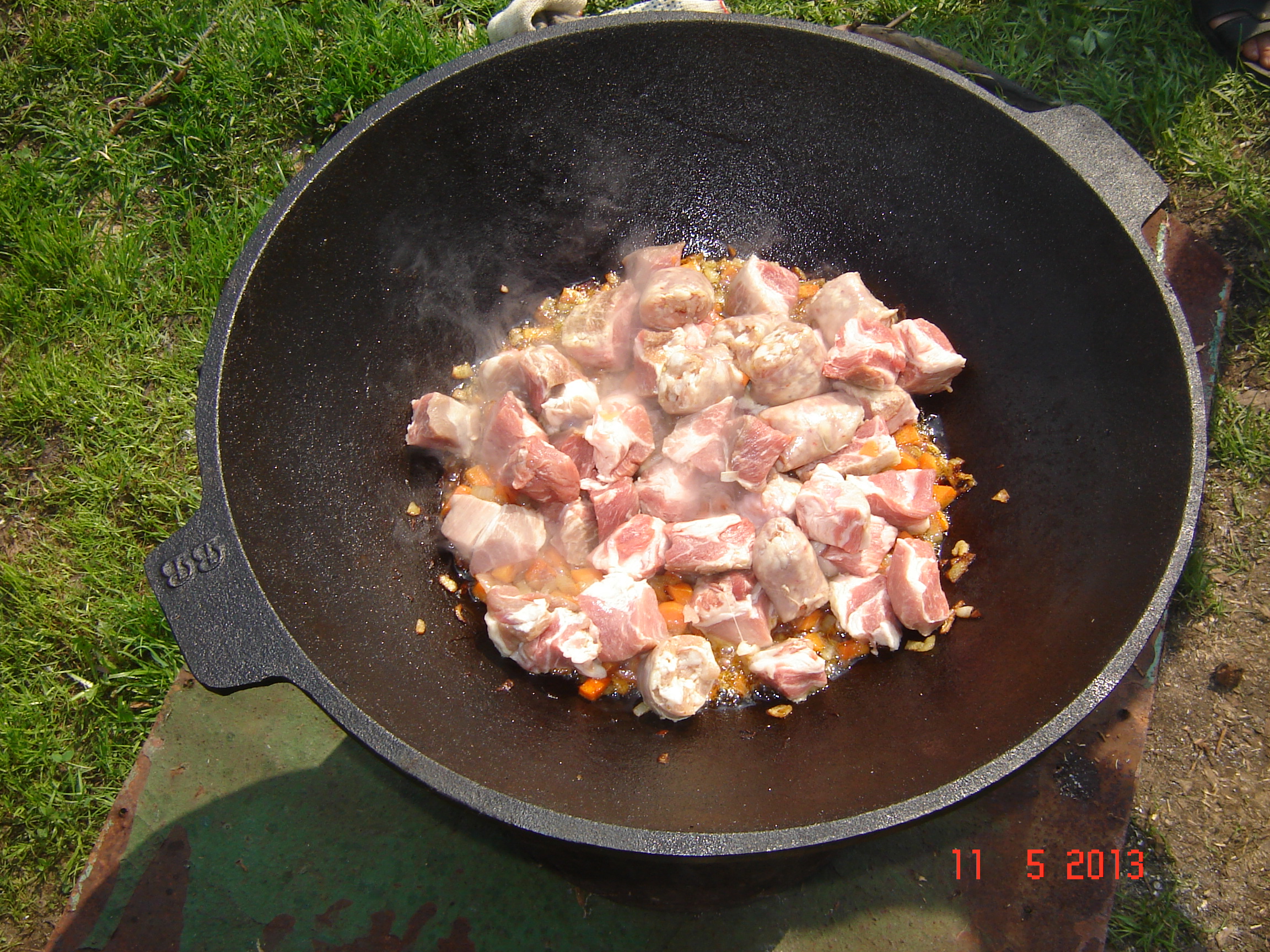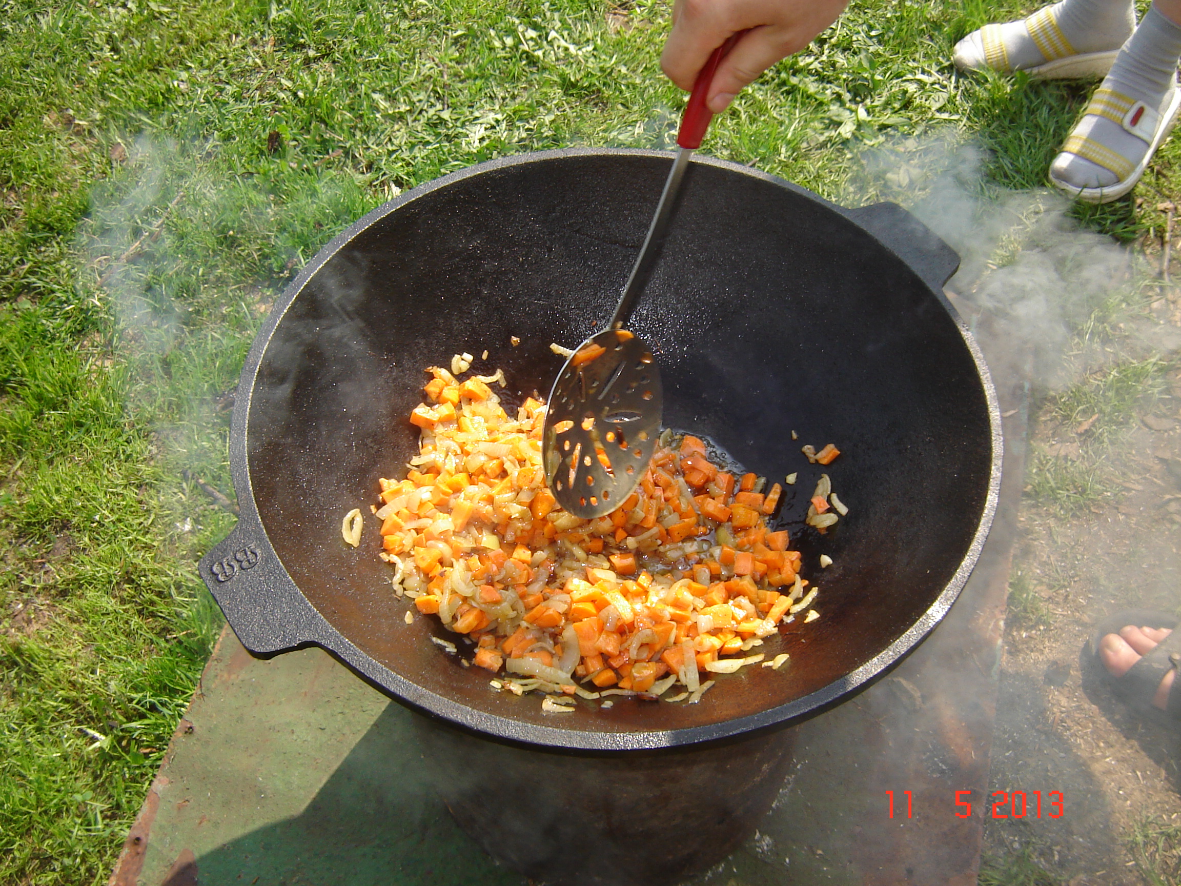 за луком идёт морковь,всё это жарится постоянно помешивая,хорошо,в так называемой буржуйке,есть дверца,которой можно регулировать силу огня...