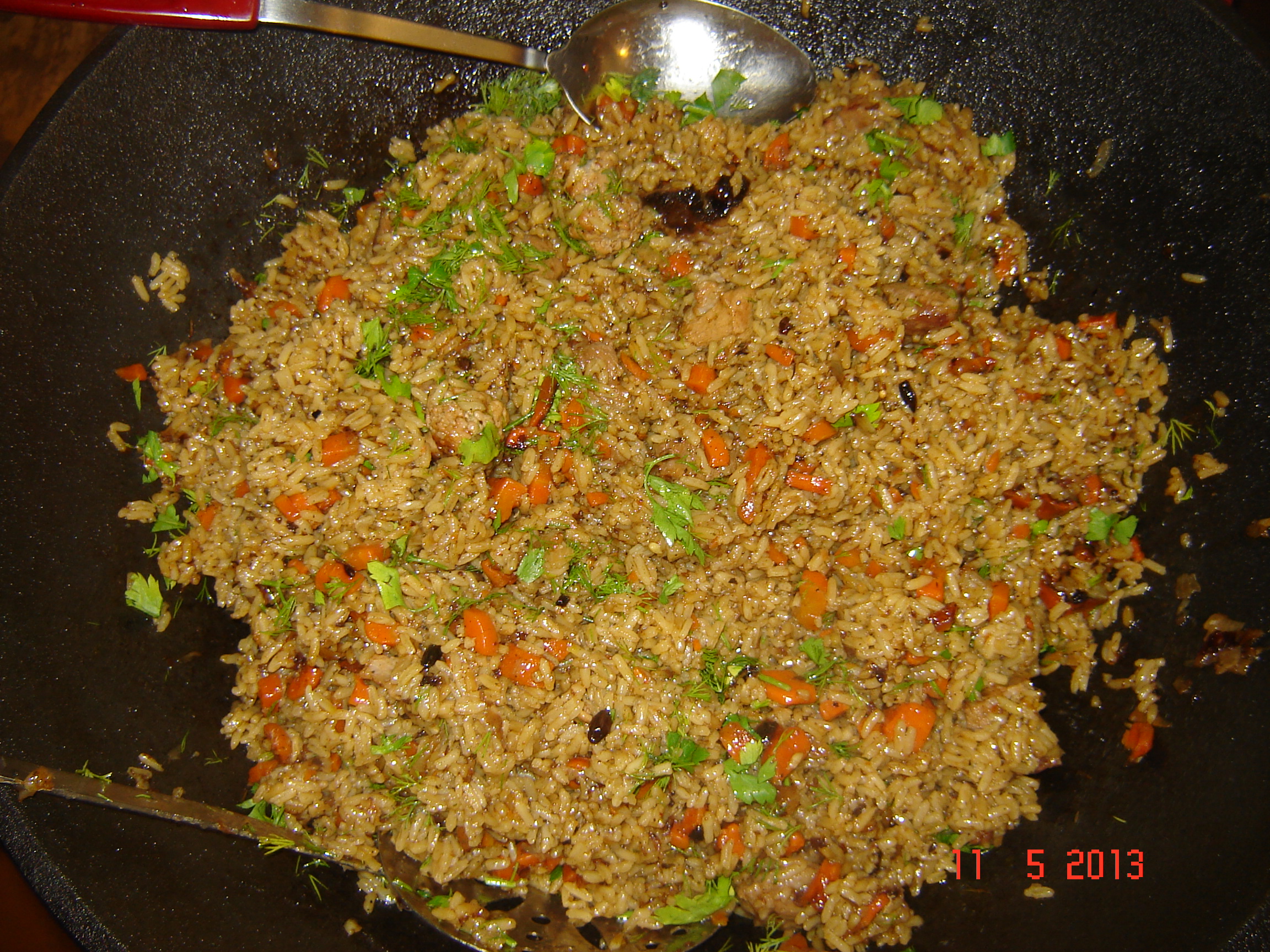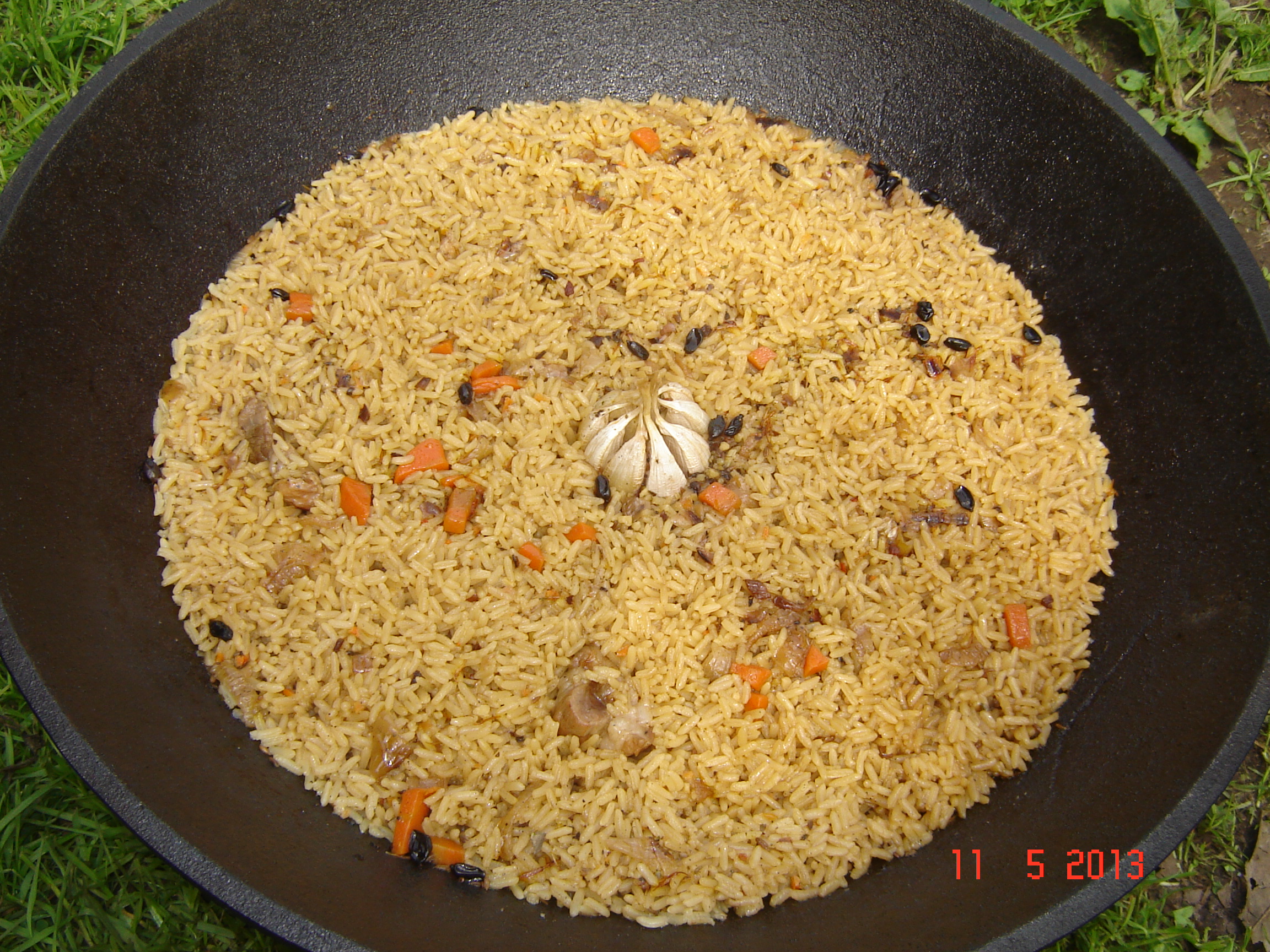 всё,мясо полуготово,засыпаем рис.рис пропаренный до этого три раза промытый и где-то настоянный в воде пол часика,когда рис добавили,его ни в коем случае не перемешиваем с морковью,лук к этому времени почти растворится.рис распростроняем по всей площади,наливаем воду где-то на два пальца, и добавляем приправу,соль,перец,пробуем...