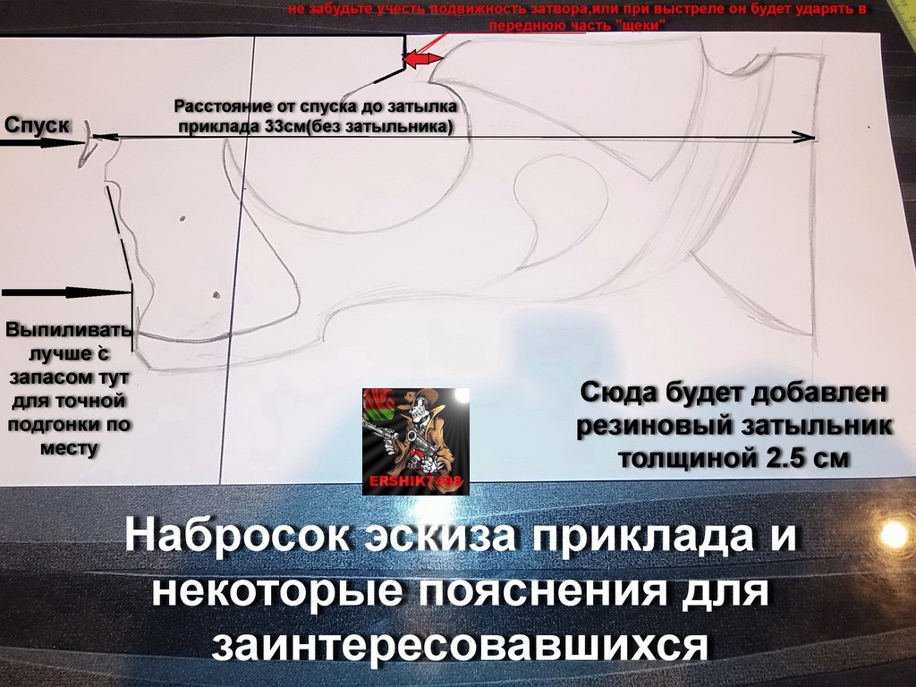 От этого зависит как точно заготовки приклада подгонятся под ложу.Затем взял ватман,уложил на него сделанный шаблон,обрисовал его.После положил по месту ложу,отметил его высоту по верхней точке.Это для ориентира на какой высоте нужно будет сделать «щёчку» на прикладе.Также отметил место спускового крючка,убрал ложу в сторонку.Итак-всё необходимое есть,есть высота,есть длина и есть размер рукоятки.Теперь точно от метки спускового крючка отмерил в сторону будущего приклада 33см-именно такой будет длина приклада,ведь он должен быть удобным в прицеливании,а не просто украшением.Делаем риску на ватмане.Теперь нужно довести весь рисунок до полной законченности,неспешно карандашиком лёгкими линиями рисуем все элементы приклада,не выходя за полученные примеркой габариты ложи.Обязательно нужно учесть также, что пистолет оснащён системой гашения отдачи,нужно сделать так,чтобы затвор мог свободно двигаться в своём направлении,чтобы при выстреле он не откатывался в сделанную Вами «щёчку» винтовки.Проследите за этим!Высота нарисованной Вами щеки не должна быть слишком уж выше линии ложи пистолета,или в уровень с ней или на 10-15 мм выше,если будет много вы сможете при обработке убрать лишние размеры.