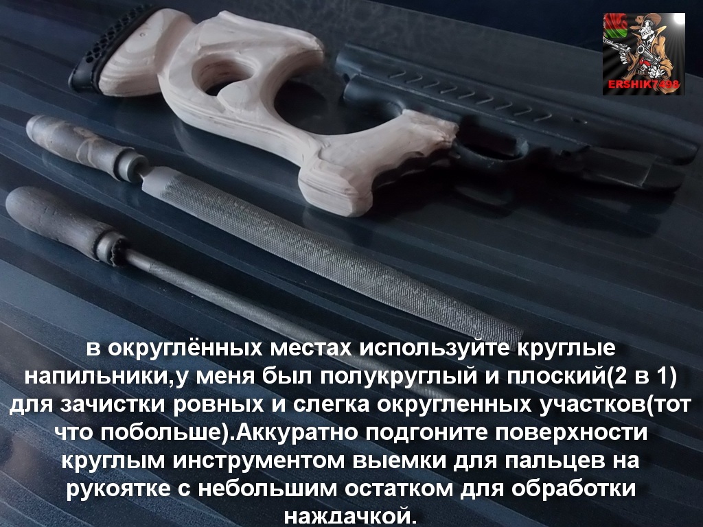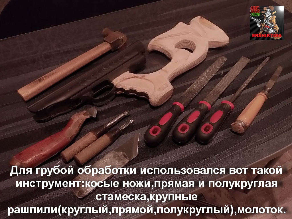 Для этого запаситесь разными сортами бумаги,начинайте обработку от средней до более мелких бумаг.Для обработки округлённых поверхностей используйте какие то круглые оправки,просто обернув их необходимой в тот момент наждачкой,прямые можно обрабатывать обернув наждачку на бруске.У меня нет никаких приспособлений типа наждака или планшайбы,поэтому всё делал вручную наждачкой.Признаюсь,хоть ручонки и не слабые-к вечеру побаливали неприятно,особенно пальцы и в запястьях,но красота требует,придётся смириться.Вот таким стал на тот момент мой приклад: