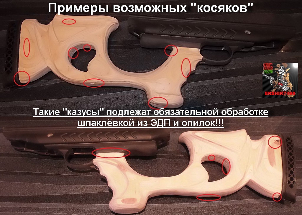 Для этого необходимо приготовить шпаклёвку из ЭДП и опилок в пропорции 50Х50,которые Вы оставили после пиления.Разводим клей,перемешиваем,добавляем опилки,снова хорошенько перемешиваем.Затем все найденные «косяки обрабатываем шпаклёвкой.Кстати,если Вы уже закрепили резиновый затыльник к прикладу,можно при необходимости обработать шпаклёвкой поверхность около него(может выступает,а может есть щели между поверхностями из-за недоклейки).Постарайтесь обработать все недочёты так,чтобы не было никаких сколов,трещин,сучков,щелей и т.д.Постарайтесь придать прикладу с ложей вид единого «монолита»,сделать их одним целым.Шпаклёвку наносите с небольшим запасом,лучше излишек удалить потом,в обработке засохшая шпаклёвка податлива.Сушим обработанный приклад около суток(шпаклёвка сохнет быстрее чем клей ЭДП).После высыхания обрабатываем эти участки с усердием наждачной бумагой,максимально!!!!На покраску надеется не стоит-никаких дефектов она не исправит,плохо обработанные участки будут очень коряво выглядить,в общем постараться надо.У меня получилось то что видите: