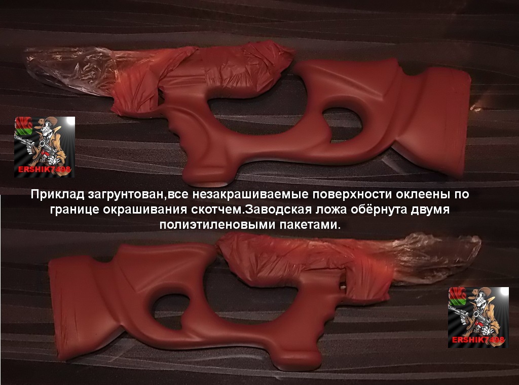 Я как всегда применял автогрунтовку BOSNY(168 цвет красно-коричневый грунт),купленную в любимом автомагазине.Хорошенько встряхиваем баллон с грунтовкой в течении минуты,так она хорошенько перемешается,снимаем колпачок и первый пшик содержимым делаем в сторону от нашего изделия(просто могут быть пылинки краски с сопла баллона,которые нам точно не нужны).Аккуратно и неспешными пшиками легонько покрываем приклад.Держите баллон от приклада на расстоянии 25-30 см,ближе если-можно наделать подтёков.Не спешите и не накладывайте толстый слой грунта.Достаточно чтобы потерялся цвет древесины.Задуйте со всех сторон ваше изделие,это только первый слой,если что-то не совсем закрасили-не беда,вторым слоем вы это исправите.Просушите окрашенный грунтом приклад около часа(при температуре 20-25 градусов это достаточно,не прикасайтесь к сохнущей поверхности,а ещё лучше дайте ей время высохнуть наверняка).Затем нанесите повторный,такой же тонкий слой грунта.Следите за подтёками,старайтесь не допускать их,главное не ложите толстый слой и держите баллон на расстоянии.Если же всё таки подтёк появился,дайте высохнуть до полного отвердения и меленькой наждачкой аккуратно удалите его,затем задуйте это место повторно.Вот так выглядел мой приклад после грунтования:
