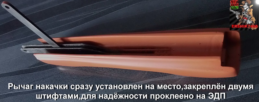 Учитывая что длина цевья мной была увеличена,делал так.Уложив цевьё на место(рычаг накачки в паз),вставил вместо крепёжных штифтов две подходящие шпильки.Затем приложив цевьё снизу СК отметил глубину паза,который был мне необходим.Теперь замерил толщину отпиленного пластмассового элемента,добавил к глубине паза такое же расстояние.Теперь приклеив пластик в полученный паз я получил идеальную длину цевья.Запирание было даже лучше,чем на «родном» образце-никаких дребезжаний,люфтов и т.д.!С «косяками» боролся так как и на прикладе-шпаклёвка,зачистка.
