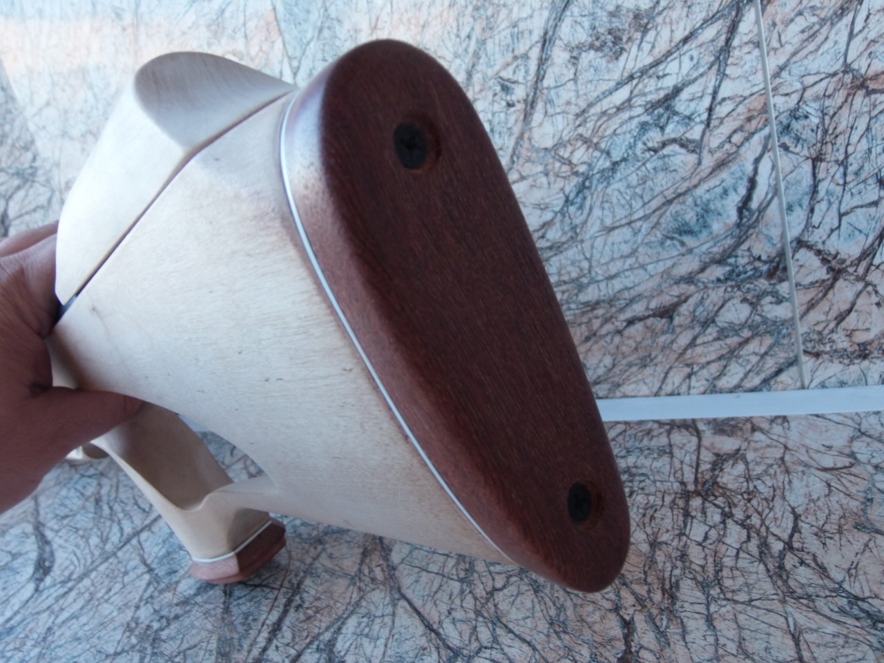 Первым делом занялся подгонкой.В ложе была выборка под резервуар.Её решено было заделать вклеенной вставкой.Чтобы сделать это-применил… не поверите! Кусок берёзового черенка от лопаты!!!Он по диаметру был едва ли не идеален для этого!Немножко подточил на станке до нужного и не шлифованный вклеил на место.Так в поры даже ЭДП лучше проник и соответственно лучше всё склеилось.После высыхания обработал и подогнал по нужным мне размерам по высоте. Ложа сделана из той же берёзы-так что всё соответствовало. Из индийской деревяхи красивой красной смастерил новый носик цевья.От сделанного цевья Димой отпилил нужную длину(прикидывал по пирамидке),на его место на шпильках и ЭДП присобачил новый красный нос через белую прокладочку из куска пластика от крышки электрокороба. Она тоненькая,изящно выглядит и отменно шлифуется,полируется.Получилось примерно так: На рукоять сделал также пяточку из той же индийской деревяхи.Также через прокладку и ЭДП+шпильки,закрепил это на основании рукоятки.Итог: Длина приклада для «заказчика» была великовата,потому отпилил нужное от приклада,из всё той же деревяшки присланной индусом,сделал я и белую прокладку,и затыльник приклада.Ну чтобы вязался между собой этот декор так сказать: Это здесь на фотках уже всё по ложе подогнано!На деле всё крепилось с допуском на обработку,и подгонял всё я уже по месту-сливал с ложей весь этот «прикид».Изготовленный Сашей задник мы укоротили.Выборку я Диму просил сделать на весь штатный задник,говорил он мне: «Давай на более короткий сделаю?Обрежешь же потом всё равно?» Нет же-не послушал!В общем отпилил и заворонил его: Для крепежа щеки приклада на шпильках(шпильки врезаны в эту щеку на резьбе с ЭДП),выточил из стали 2 маховика с накаткой и резьбой М6 и 2 втулки под эти маховики с той же внутренней резьбой.Как бы и не нужна была щека регулируемая,хватало стрелку и в сложенном виде высоты прицеливания в диоптр,но щека эта закрывала и задник компрессора,и кусок его самого,да к тому же и то безобразие что я смудрил…За помощь в изготовлении втулок скажу дружку Артёму огромное СПАСИБО!!! А чтобы закрыть лишнюю выборку за задником компрессора-вклеил я в неё вставочку из той же берёзы.Также выточил новые крепёжные винты в боковины ложи с более массивными шляпками под шлиц.Передний крепёжный винт в пирамидку был найден готовый-изменил форму шляпки и сделал его также под шлиц.Во все крепёжные отверстия под эти винты были вклеены стальные шайбы для жёсткости.Железяки эти в нужных местах чуть позже заворонил.А теперь пояснения фотками.Вклеенная вставка за компрессором и выточенные маховики с втулками(не зачищено): Это сама регулируемая щека со шпильками на резьбе+ЭДП: Это уже воронёные выточенные железяки в полном составе: Ну и после зачистки высохшего ЭДП в месте вклейки вставки берёзовой за задником,собрал «для посмотреть» получающееся на тот момент.Вставил «ИЖ» в ложу,закрутил три крепёжных винта,вставил на место щеку шпильками в отверстиях в ложе,затянул маховичками.Втулки под маховики были закручены пока только на резьбу-была нарезана на внешней стороне их именно резьба с крупным зубом.А на самой втулке с лицевой стороны сделан пропил под широкую шлицевую отвёртку.Потребовалось несколько минут чтобы просверлить в ложе 2 отверстия на нужную глубину и необходимыми диамет