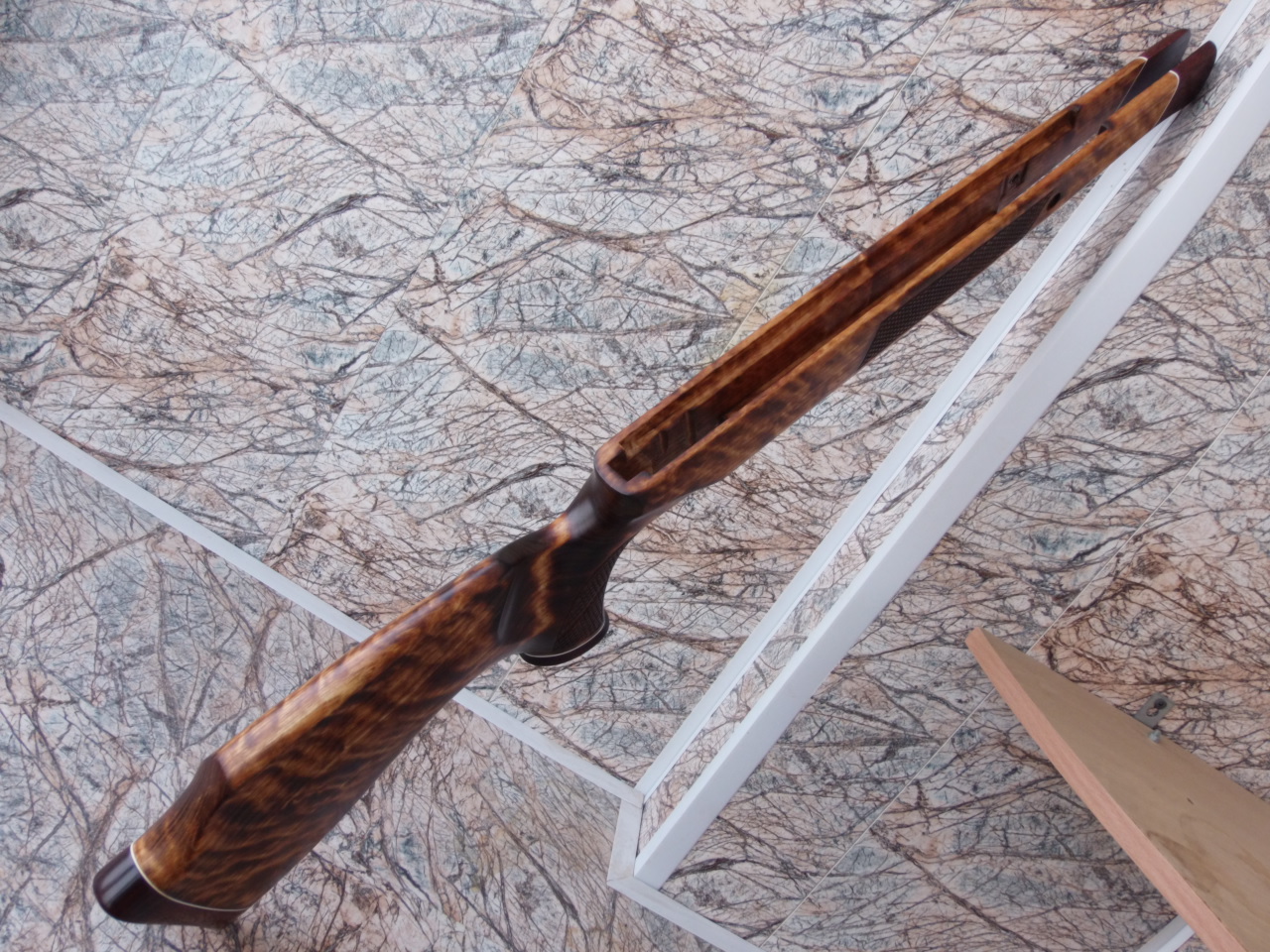 Приступил к пропитке. Очень быстро иссяк остаток в маленьком флаконе,открыл новую бутылочку. Растирал тщательно,но совсем не жалея. Его сколько не лей-оно всё лезет и лезет в деревяху. Но решил что нанесённых первым слоем грамм 80-90 вполне хватит. Ну и зафиксировал для истории ложу под нанесённым маслом. Результат меня очень порадовал! Опять же! Предложил владельцу не окрашивать ложу морилкой. Очень уж не хотелось рисковать потерей эффекта тигровости на ложе. Да и сама текстура могла спрятаться бесследно под морилкой-как ты её потом после нанесения не растирай!Хоть водой,хоть самогонкой))) Не тот берёза материал,чтобы как в буке или орехе вскрыть текстурку! Плотность совсем другая у неё и фактура. Снова получил согласие на своё предложение,тем более после льняного масла планировалось наносить Дениш ойл «тёмный орех». Посчитали что будет достаточно только масел, чтобы добиться цвета как на картинке-образце. Ну и вот что стало после первого нанесённого слоя! Просто шикарно!Неужели не согласитесь? Фото:
