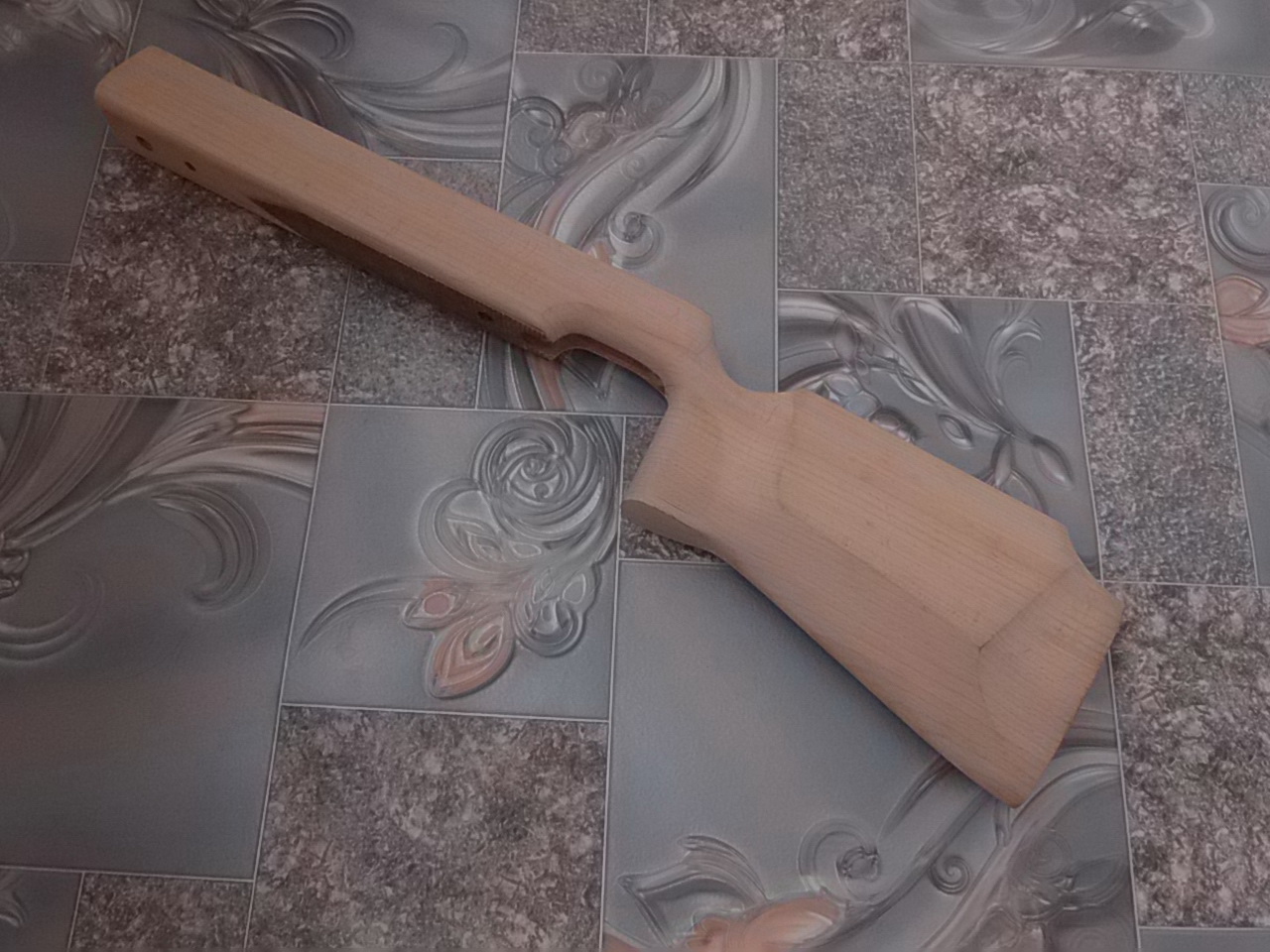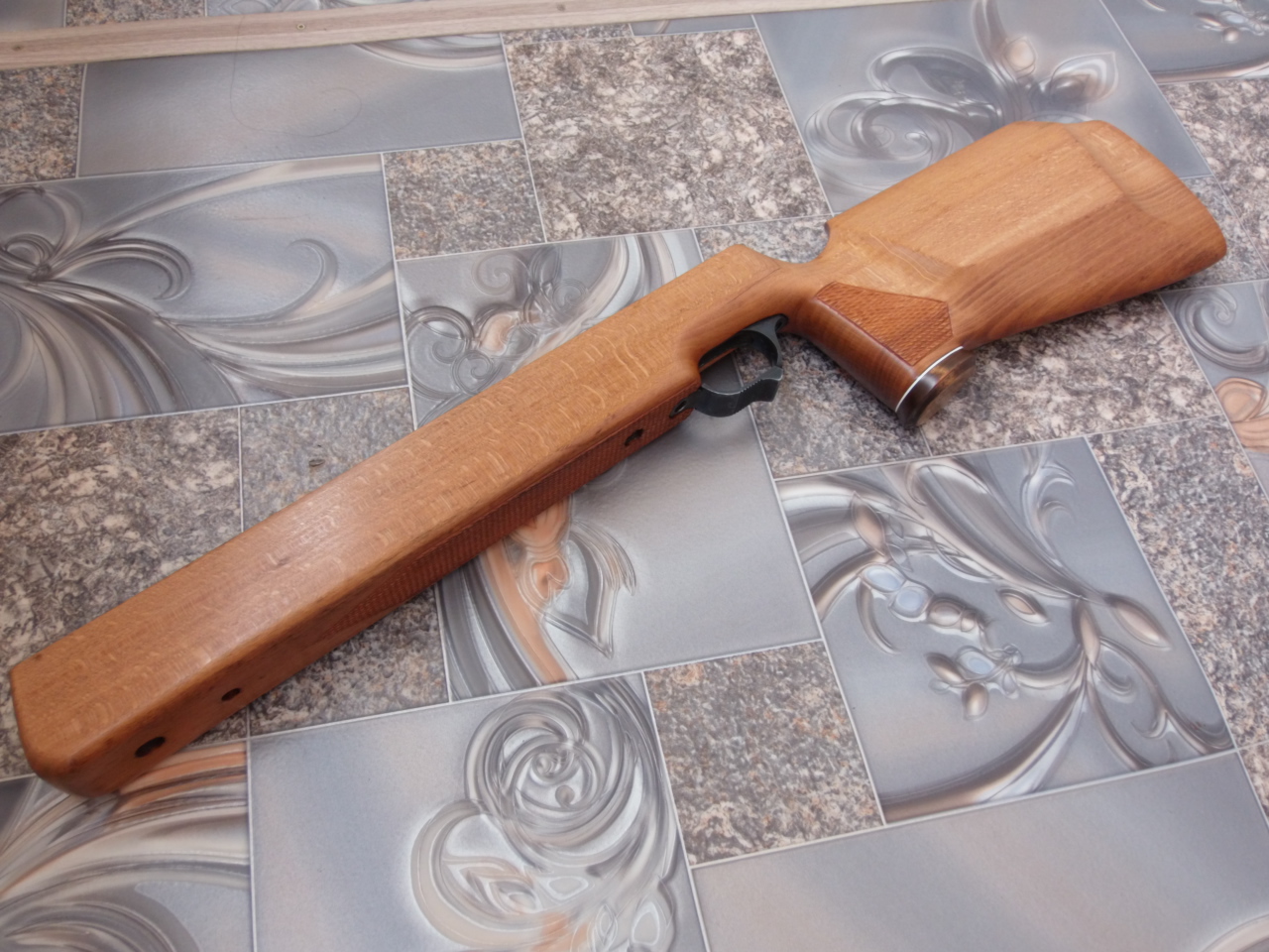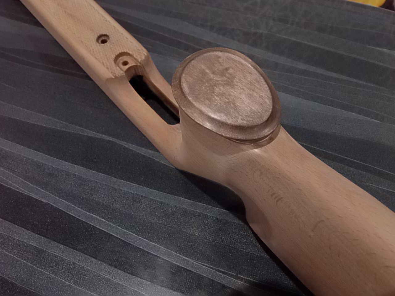 В тон рукояти решил задекорировать слегка и затылок приклада. Родной затыльник регулируемый к прикладу был-к нему изготовил прокладку из того же материала,обработал,отполировал краешки. Вот что вышло: