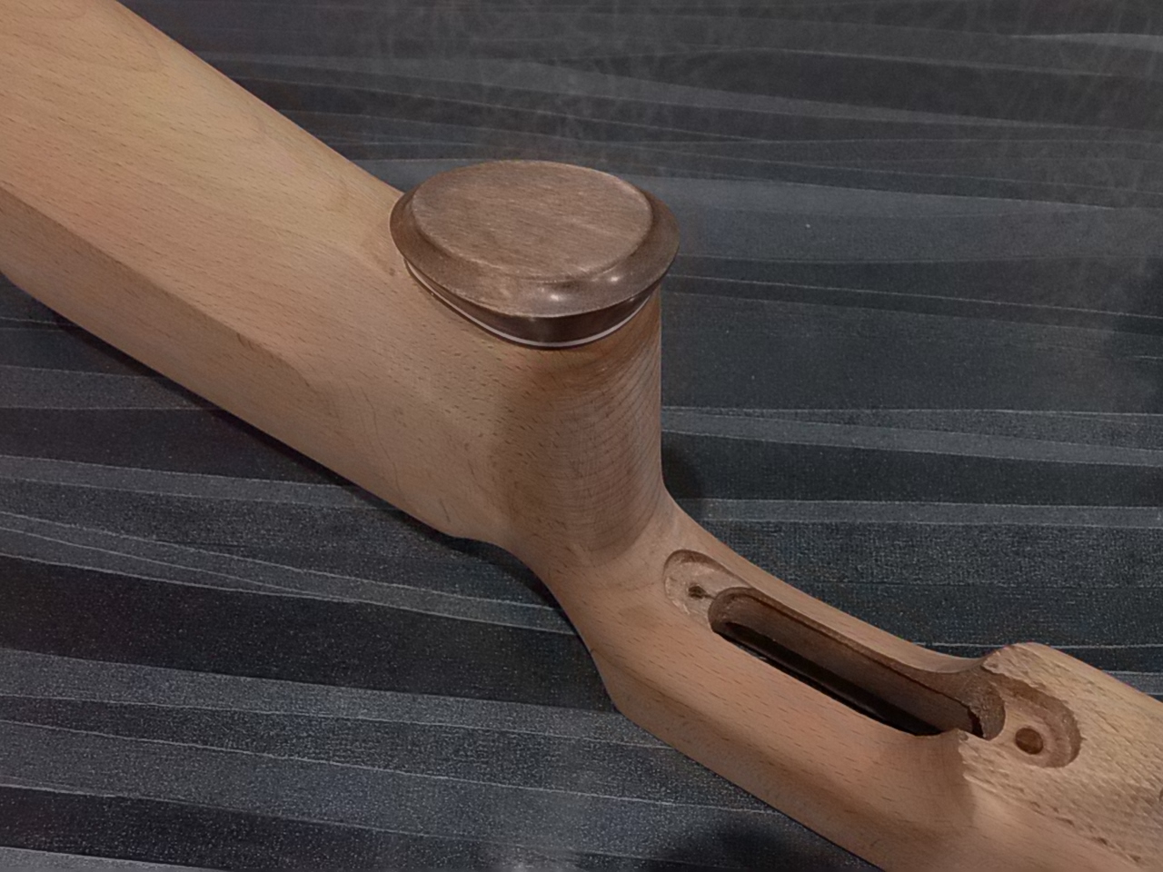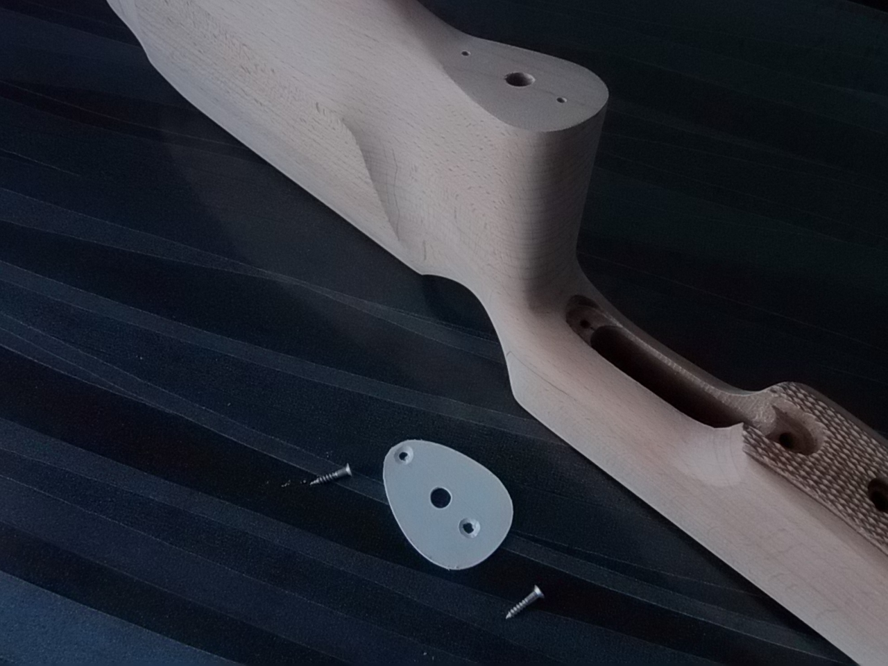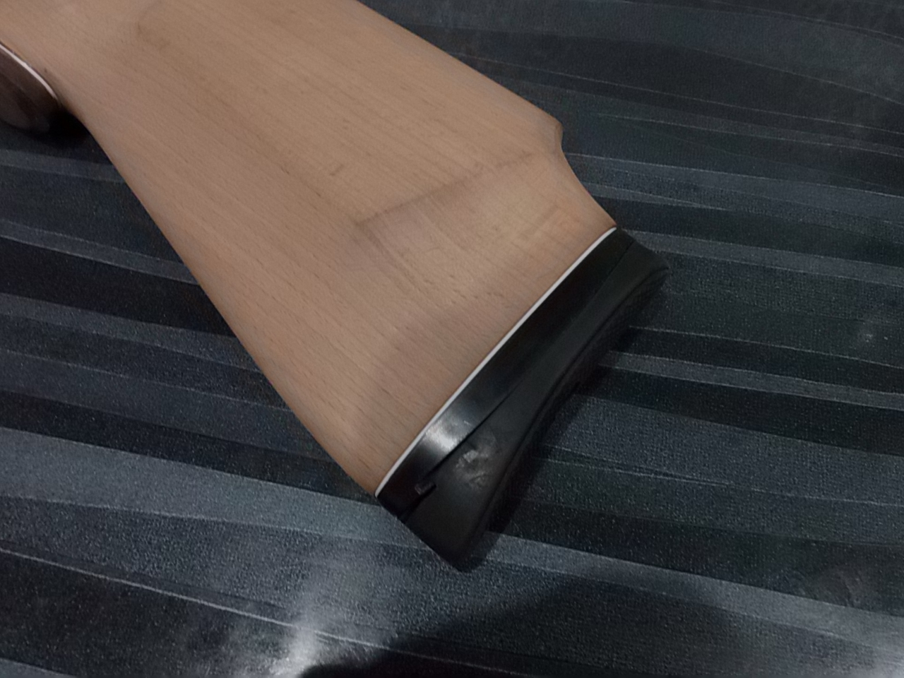 В тон рукояти решил задекорировать слегка и затылок приклада. Родной затыльник регулируемый к прикладу был-к нему изготовил прокладку из того же материала,обработал,отполировал краешки. Вот что вышло: