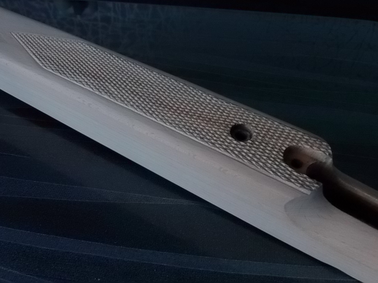 На рукояти решил также навести некоторый «марафет». Также насечку (только позже) и пяточку с белой тонкой прокладкой. Для пяточки отыскал симпатичный кусочек из какой-то фруктовой породы-то ли вишня,то ли слива. Честно сказать-не разобрался,но сгодится! Прокладка традиционно из крышки белого электрокороба. Прокладку приложил к основанию рукояти,отметил и просверлил отверстия в ней.Крайние-под маленькие саморезы для крепежа прокладки к рукояти,среднее большее-для фиксации пяточки.