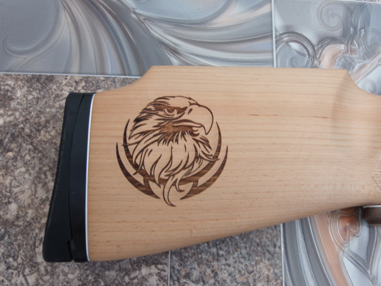 Не особо мудрёный,но благородных кровей орлёнок. В общем знакомые помогли в мастерской, за небольшие деньги гравирнули мне (Ой! Что это я? Вовке!) этого птенчика. Получилось ну ооооочень здорово! При нанесении гравировки краешки рисунка немного подкоптились и обуглились. Но лечится это довольно просто-смачивается 9% уксусом чистая мягкая тряпочка ,и без нажима протирается весь нанесённый рисунок. После этого становится всё чистеньким и аккуратным. К тому же после гравирования место это почему-то становится и липким-после обработки уксусом липнуть перестаёт! После высыхания уксуса достаточно пройтись по гравировке наждачкой 2000! И получается красота. Вот примерно так-слева гравировка очищена уксусом (на тряпке видна гарь и чуть влажный приклад),справа-высохшая и обработанная 2000-ной бумагой птичка.Тряпочка уже чистая-грязи никакой не собирает: