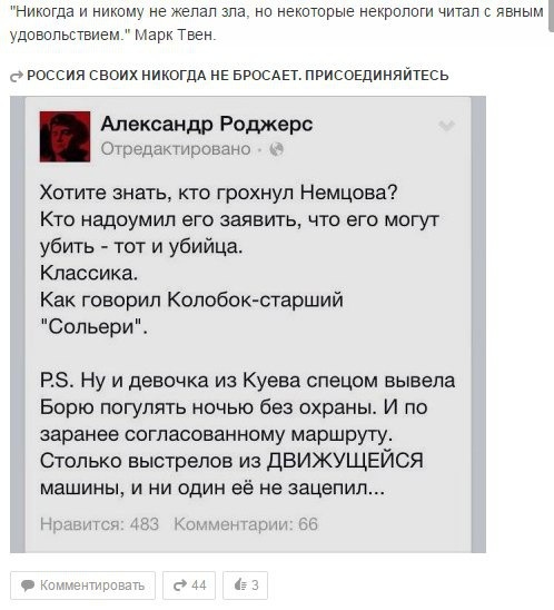 Данная история максимально ясно высветила , что на самом деле против Путина стоят именно такие циничные политиканы или (заказчики) которые не остановятся ни перед какими провокациями , им , что в Боинге 200 человек грохнуть, что известного политика в центре Москвы....