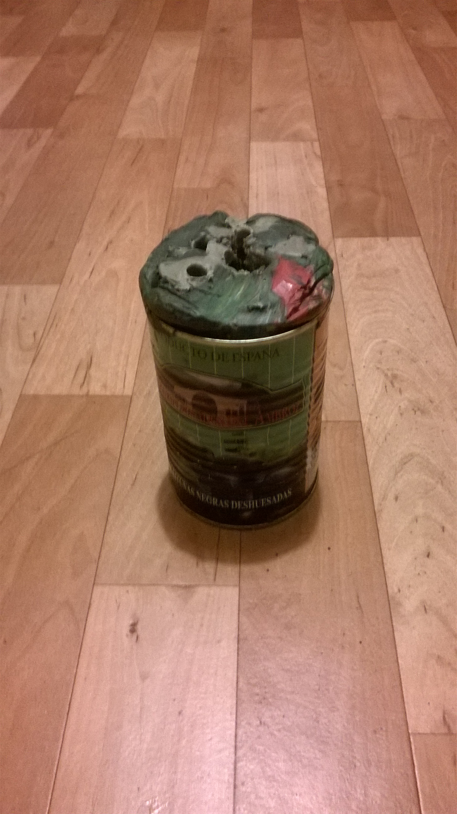 Получился он довольно увесистый но зато дополнительно крепить к поверхности не нужно : просто поставил куда надо и стреляй. Внутрь закладывается кусок ткани чтобы ничего не вылетало из него. Обычно это старый носок (чистый естественно :-): ) Мишень крепится магнитами к конусу. Все просто и удобно . С пульками проблем не бывает , а вот с шарамета если попасть во внешнюю часть может быть рикошет .