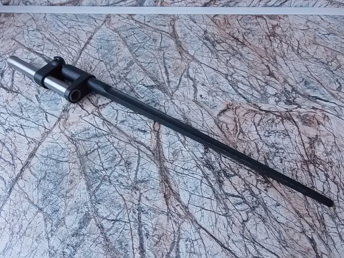 Саша,хвостовик штыка был напечатан отдельной деталью. В штыке и в нём почти до отверстия под винт сделана пустота Ф5,5мм. Подобрал стальную шпильку,на конце одном нарезал резьбу М6 около 10см . Далее за резьбой до самого конца шпильку на наждаке сточил до 5мм. Так чтобы штык безпрепятственно на неё налезал до резьбы.На ЭДП закрутил эту шпильку резьбой в хвостовик.Резьбу метчиком в хвостовике не резал-она отлично нарезается самой шпилькой в пластике. Ещё немного резьбы оставалось чтобы навинтить на том же ЭДП сам штык. Хорошенько обезжирил шпильку,не жалея намазал эпоксидкой и одел штык на шпильку. Клеем его отталкивало назад,вот для этого и оставил участок с резьбой! На смазанную клеем шпильку- на остаток резьбы подобно хвостовику навинтил сам штык. После того как высох клей,получилась крепкая монолитная конструкция!!!