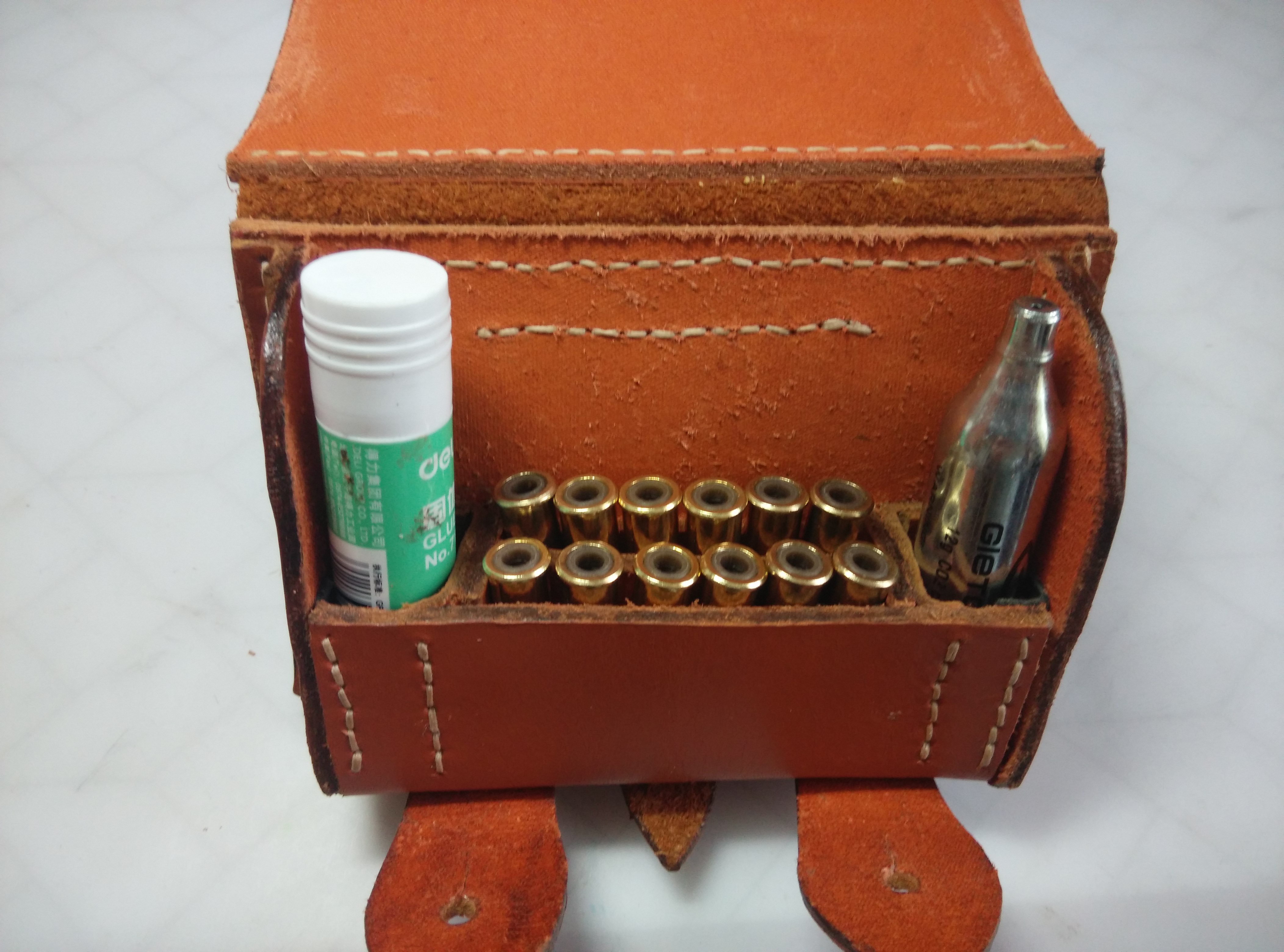 В патронташе предполагается иметь запасной СО-балон, и "боеприпас". Под пули подошел тубус от твердого канцелярского клея. Можно найти и что нибудь иное.