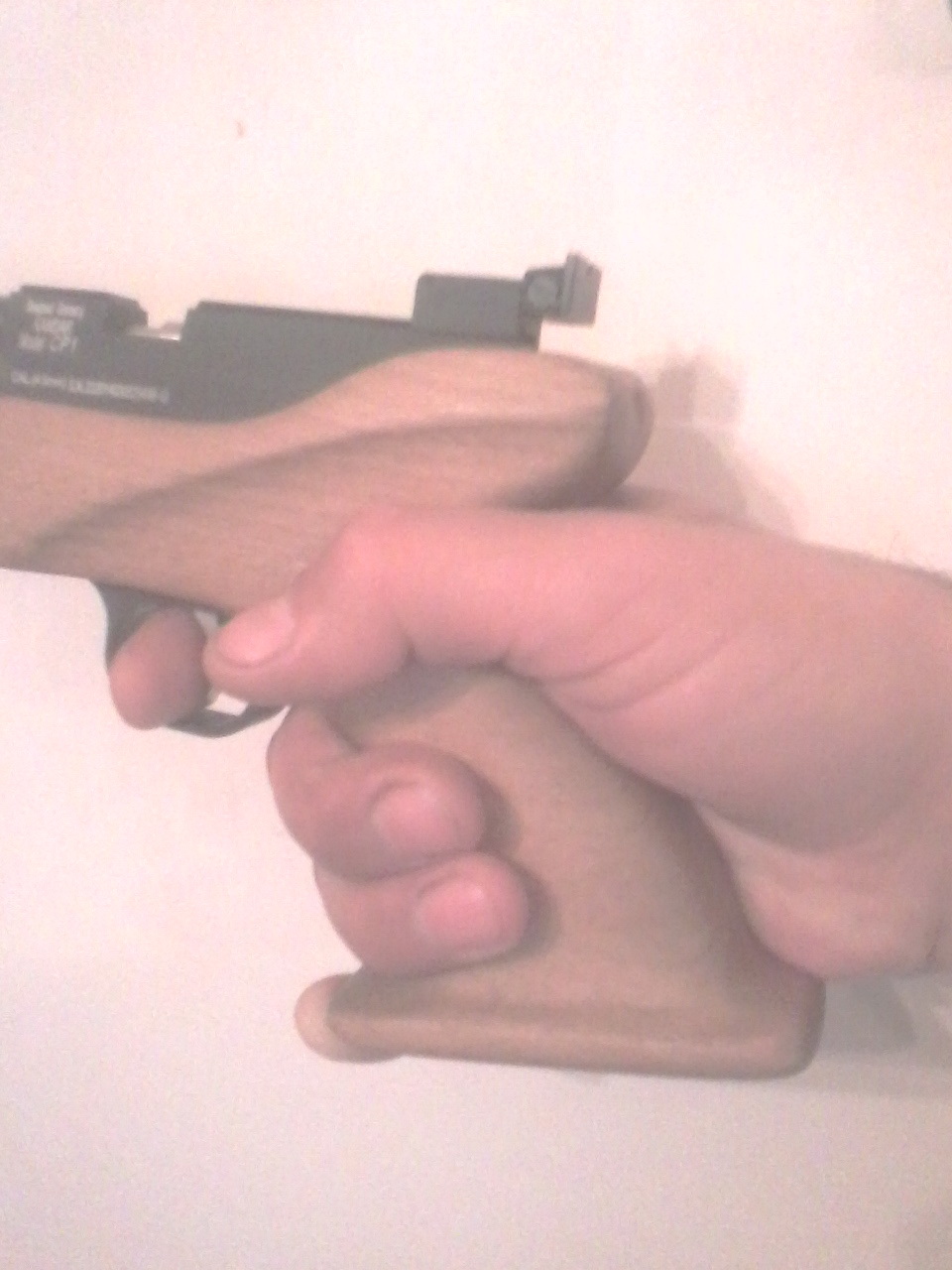 Пилить нужно верхнюю часть рукоятки, чтобы посадить пистоль ниже в руке.мизинец можно действительно оттопырить,практически не участвует в удержании.