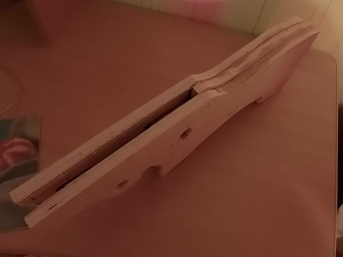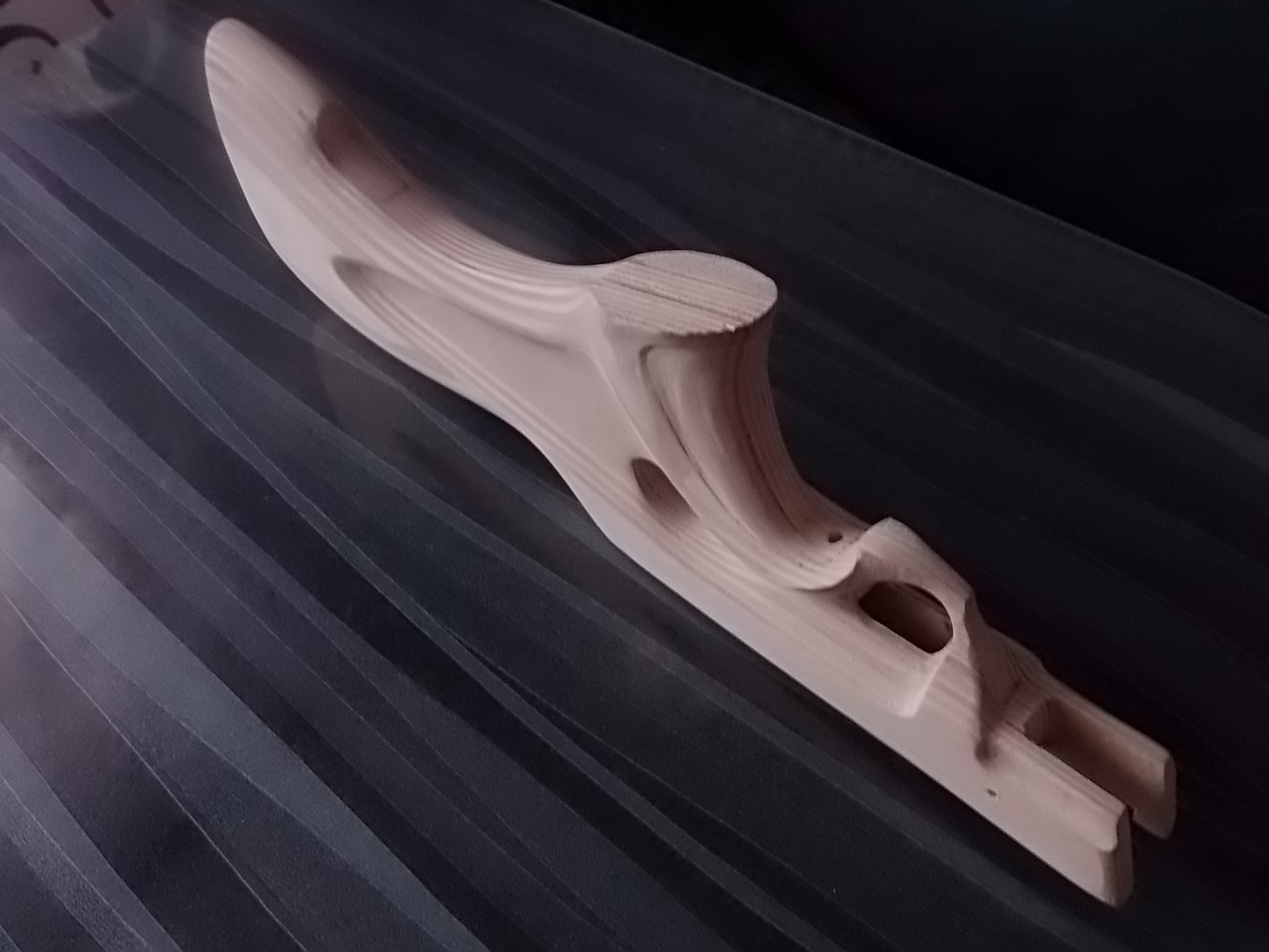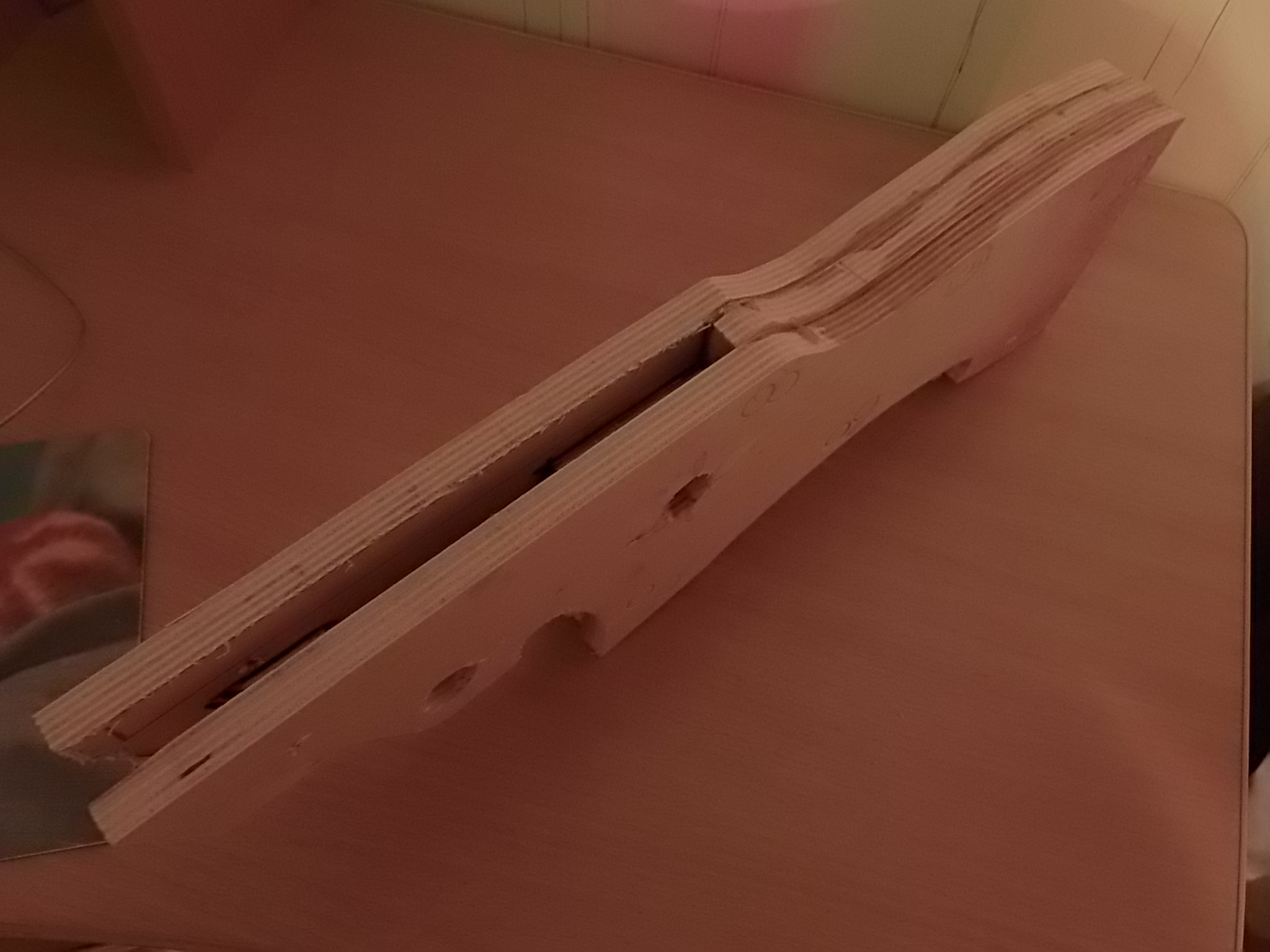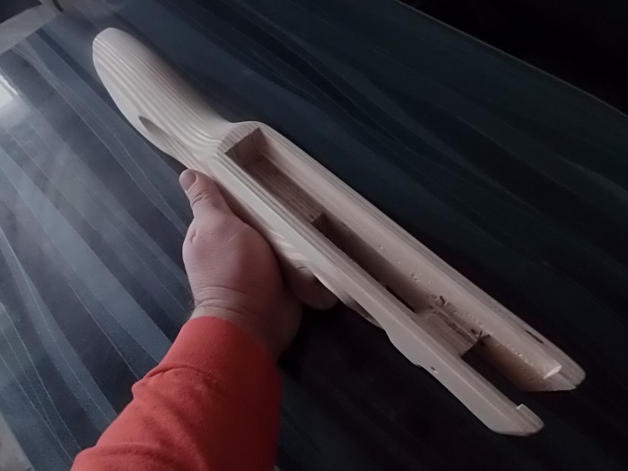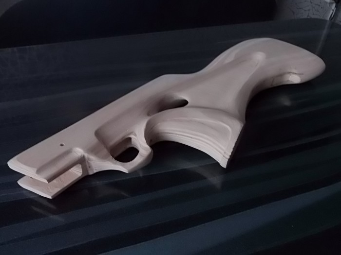 1)Выпилил три заготовки из 15мм мебельной фанерки.Одну среднюю и две боковых.Среднюю как обычно вывел по очертанию железа пистолета.Это упрощает выборку под него в дальнейшем.Ширина фанеры как раз в размер УСМ пистолета.Остаётся только сделать полукруглую выборку под компрессор на внутренней стороне боковин ложи.Склеил заготовки на ЭДП,предварительно просверлил крепёжные отверстия.Вот заготовка: