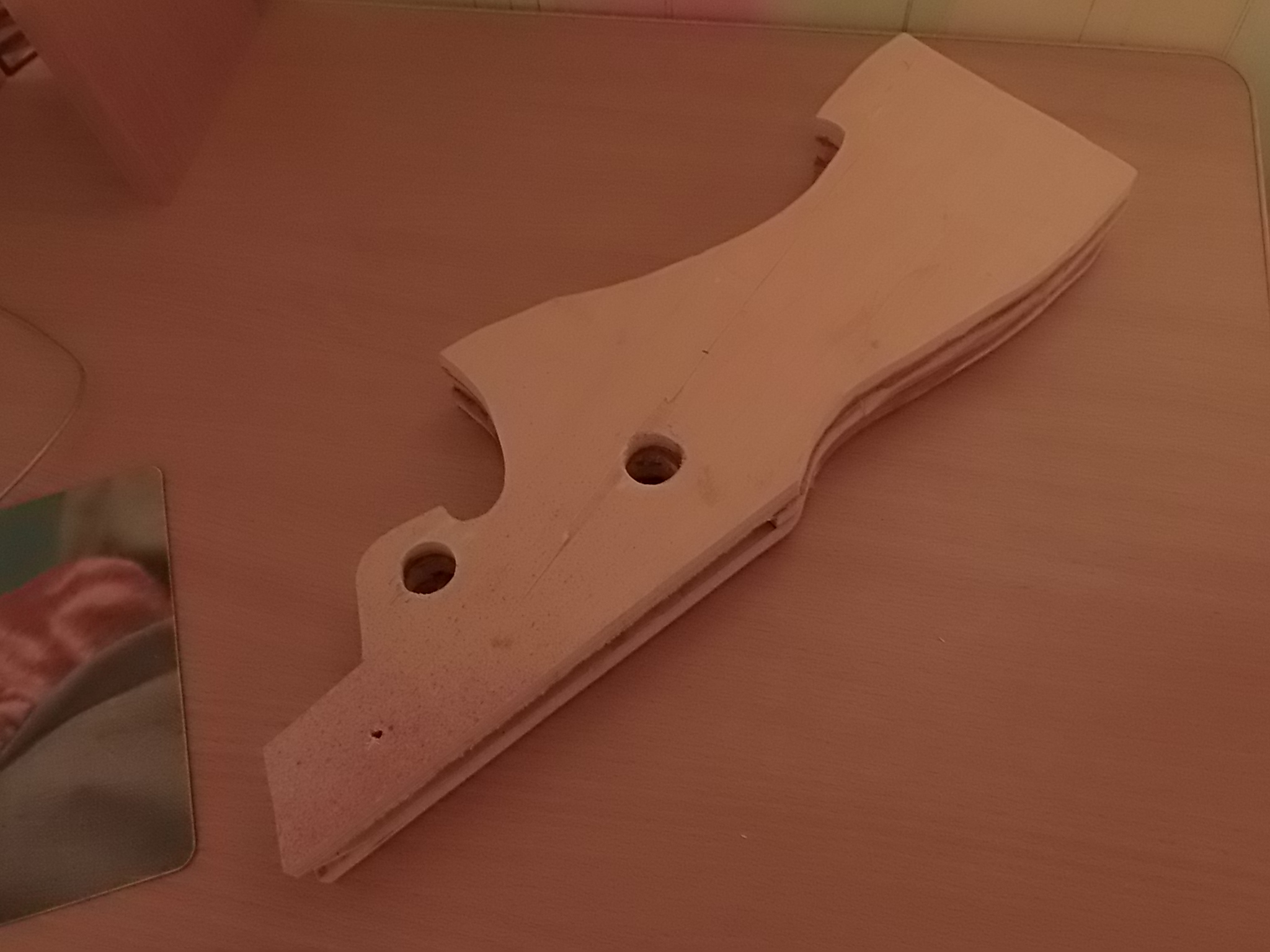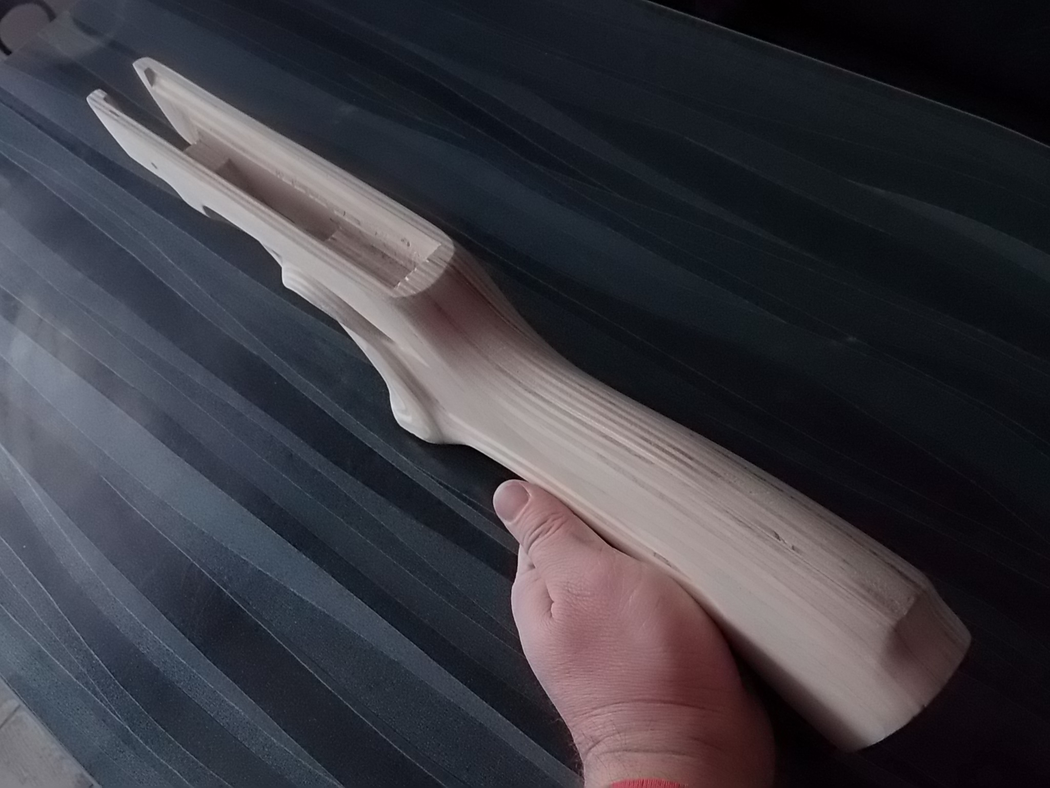 4)Из тонкого белого пластика(крышка электрокороба) сделал две прокладки-одну на рукоять,вторую на затылок приклада.Наличие резинового затыльника планировалось сразу("Байкал" без логотипа).На ЭДП приклеил его к основанию рукояти,затем вклеил сам чёпик из берёзы следом.