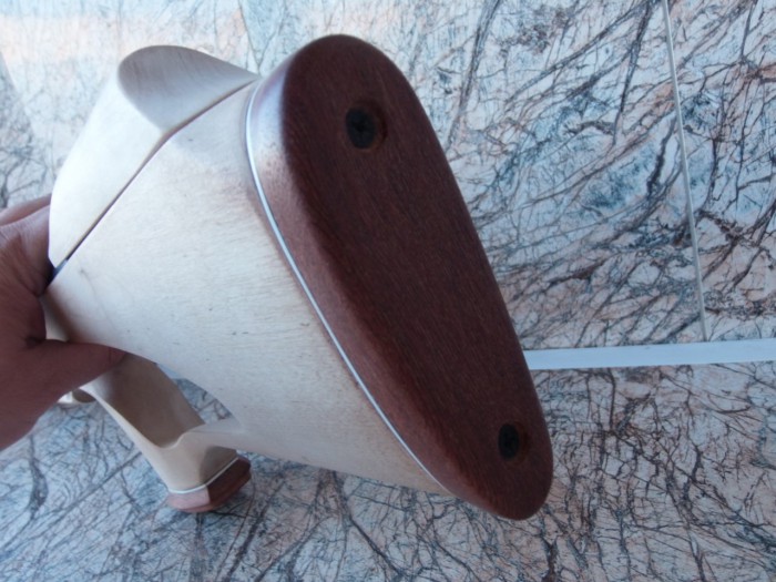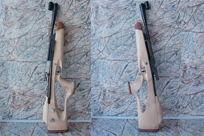 Первым делом занялся подгонкой.В ложе была выборка под резервуар.Её решено было заделать вклеенной вставкой.Чтобы сделать это-применил… не поверите! Кусок берёзового черенка от лопаты!!!Он по диаметру был едва ли не идеален для этого!Немножко подточил на станке до нужного и не шлифованный вклеил на место.Так в поры даже ЭДП лучше проник и соответственно лучше всё склеилось.После высыхания обработал и подогнал по нужным мне размерам по высоте. Ложа сделана из той же берёзы-так что всё соответствовало. Из индийской деревяхи красивой красной смастерил новый носик цевья.От сделанного цевья Димой отпилил нужную длину(прикидывал по пирамидке),на его место на шпильках и ЭДП присобачил новый красный нос через белую прокладочку из куска пластика от крышки электрокороба. Она тоненькая,изящно выглядит и отменно шлифуется,полируется.Получилось примерно так: На рукоять сделал также пяточку из той же индийской деревяхи.Также через прокладку и ЭДП+шпильки,закрепил это на основании рукоятки.Итог: Длина приклада для «заказчика» была великовата,потому отпилил нужное от приклада,из всё той же деревяшки присланной индусом,сделал я и белую прокладку,и затыльник приклада.Ну чтобы вязался между собой этот декор так сказать: Это здесь на фотках уже всё по ложе подогнано!На деле всё крепилось с допуском на обработку,и подгонял всё я уже по месту-сливал с ложей весь этот «прикид».Изготовленный Сашей задник мы укоротили.Выборку я Диму просил сделать на весь штатный задник,говорил он мне: «Давай на более короткий сделаю?Обрежешь же потом всё равно?» Нет же-не послушал!В общем отпилил и заворонил его: Для крепежа щеки приклада на шпильках(шпильки врезаны в эту щеку на резьбе с ЭДП),выточил из стали 2 маховика с накаткой и резьбой М6 и 2 втулки под эти маховики с той же внутренней резьбой.Как бы и не нужна была щека регулируемая,хватало стрелку и в сложенном виде высоты прицеливания в диоптр,но щека эта закрывала и задник компрессора,и кусок его самого,да к тому же и то безобразие что я смудрил…За помощь в изготовлении втулок скажу дружку Артёму огромное СПАСИБО!!! А чтобы закрыть лишнюю выборку за задником компрессора-вклеил я в неё вставочку из той же берёзы.Также выточил новые крепёжные винты в боковины ложи с более массивными шляпками под шлиц.Передний крепёжный винт в пирамидку был найден готовый-изменил форму шляпки и сделал его также под шлиц.Во все крепёжные отверстия под эти винты были вклеены стальные шайбы для жёсткости.Железяки эти в нужных местах чуть позже заворонил.А теперь пояснения фотками.Вклеенная вставка за компрессором и выточенные маховики с втулками(не зачищено): Это сама регулируемая щека со шпильками на резьбе+ЭДП: Это уже воронёные выточенные железяки в полном составе: Ну и после зачистки высохшего ЭДП в месте вклейки вставки берёзовой за задником,собрал «для посмотреть» получающееся на тот момент.Вставил «ИЖ» в ложу,закрутил три крепёжных винта,вставил на место щеку шпильками в отверстиях в ложе,затянул маховичками.Втулки под маховики были закручены пока только на резьбу-была нарезана на внешней стороне их именно резьба с крупным зубом.А на самой втулке с лицевой стороны сделан пропил под широкую шлицевую отвёртку.Потребовалось несколько минут чтобы просверлить в ложе 2 отверстия на нужную глубину и необходимыми диамет