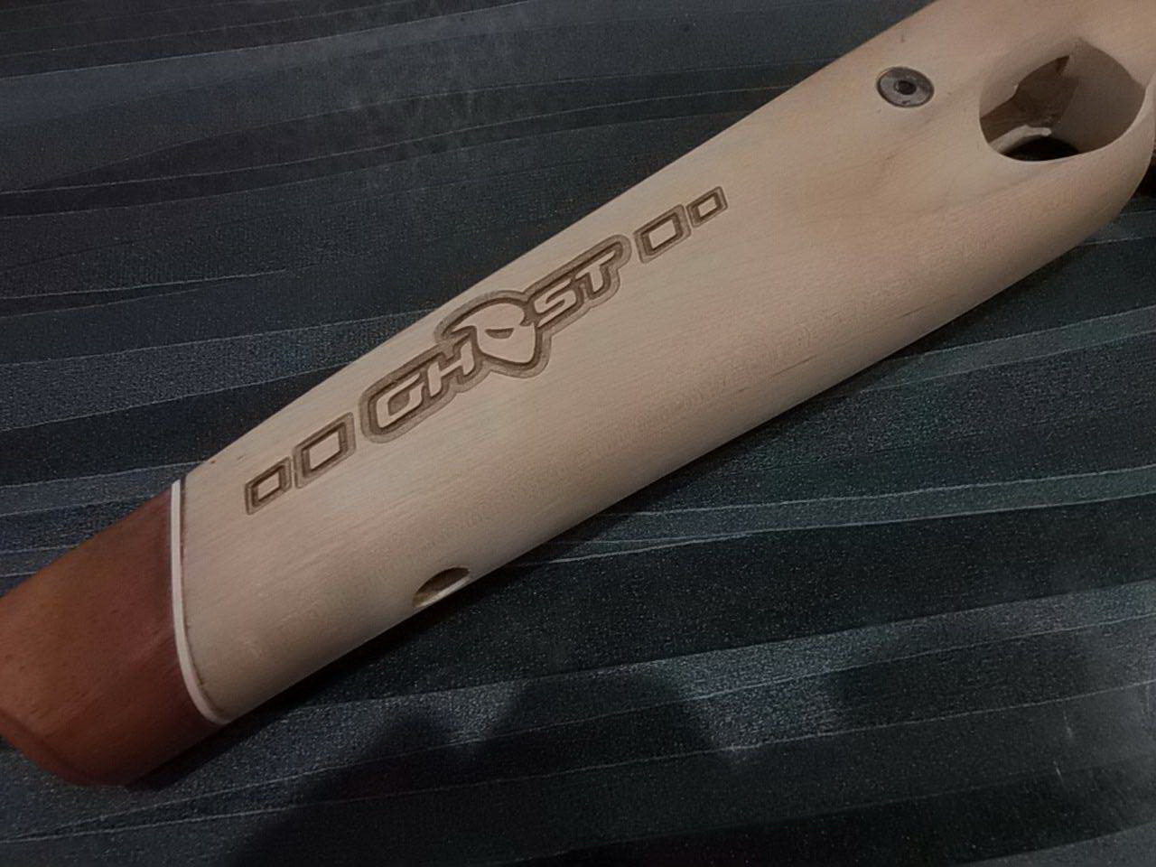 После решил дополнить декорирование ложи лазерной гравировкой. Рабочее название ложи было «Призрак»-уж простите,но люблю я давать своим изделиям какие-нибудь «погремухи».Именно такую «татуировку» решил я нанести в боках ложи.Служила она не только в плане декора,но и была полезна в хвате за цевьё.Также как и на наколотке рука по этим логотипам не скользила.Получилось собственно так: